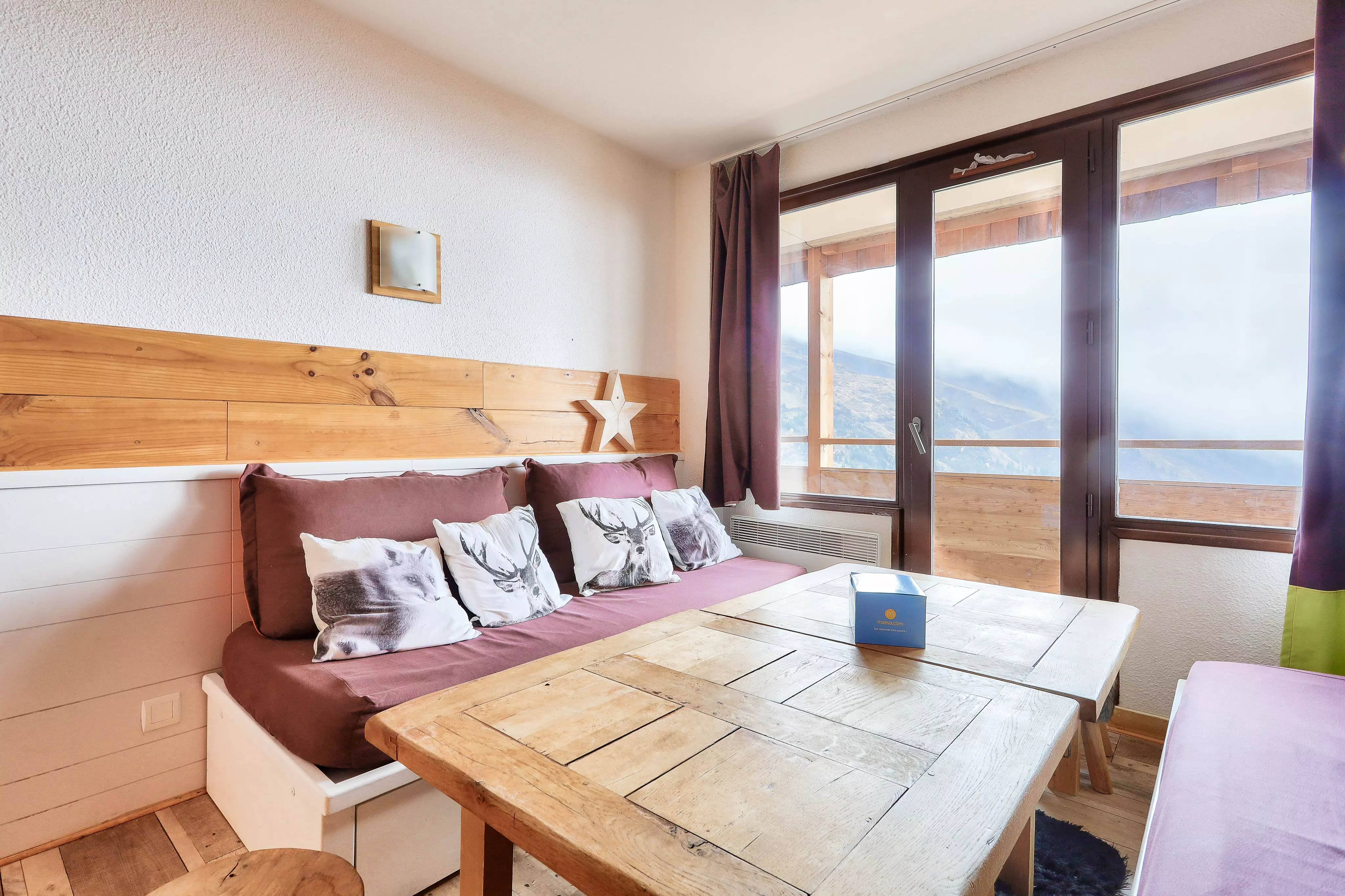 Les atouts de votre location : Studio ski aux pieds avec balcon aménagé exposé Sud et vue sur les montagnes.