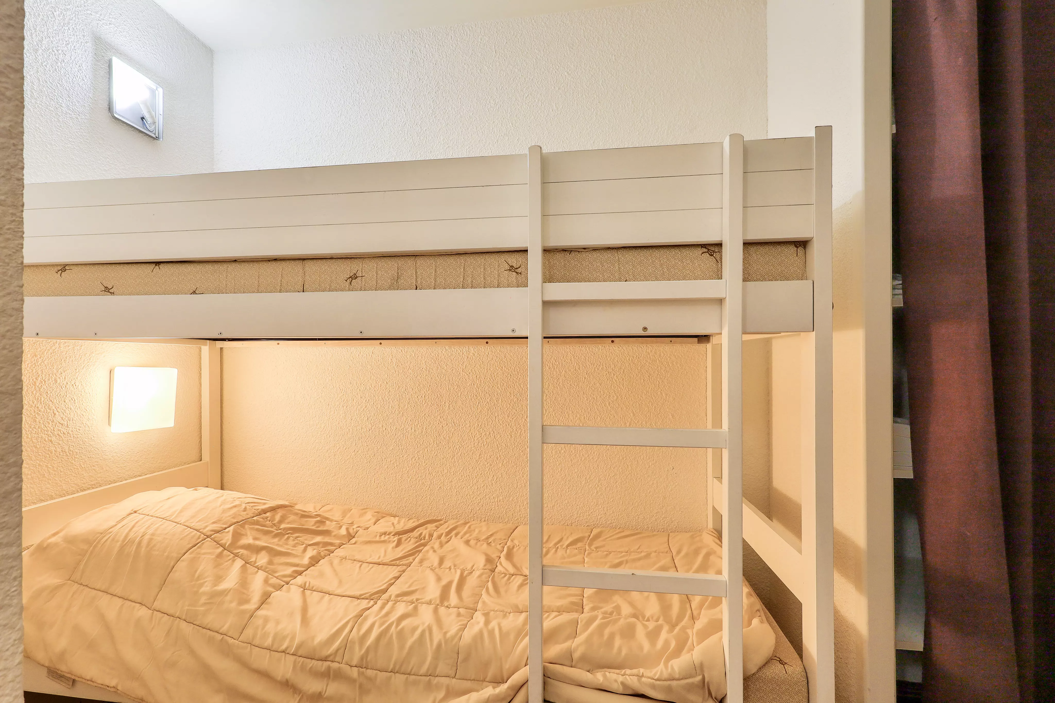 - Équipements séjour : 2 lits-banquettes dont 1 avec 1 lit gigogne et 1 coin cabine sans porte avec 2 lits superposés.