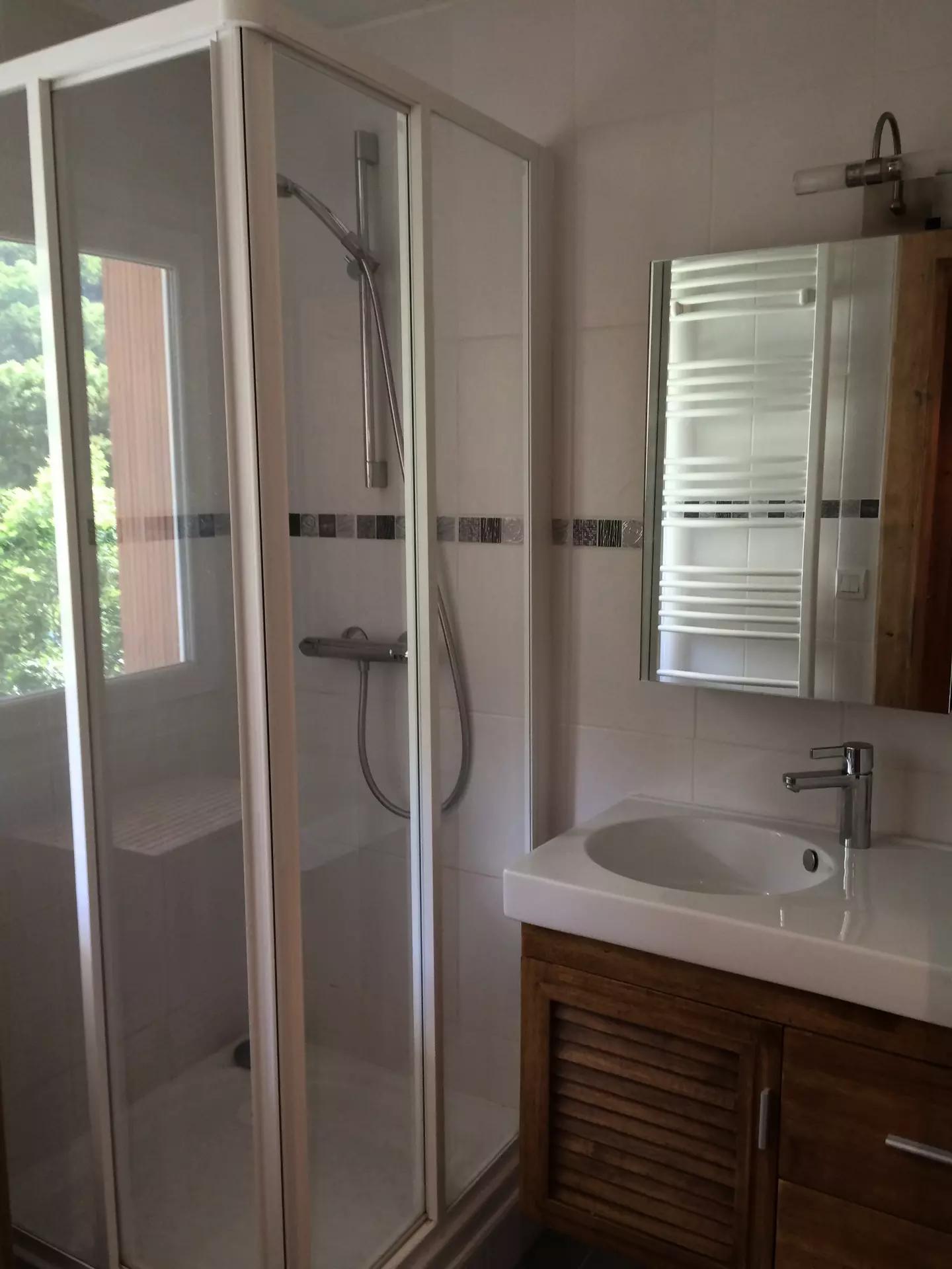 Salle d'eau : douche, lavabo et sèche-cheveux.