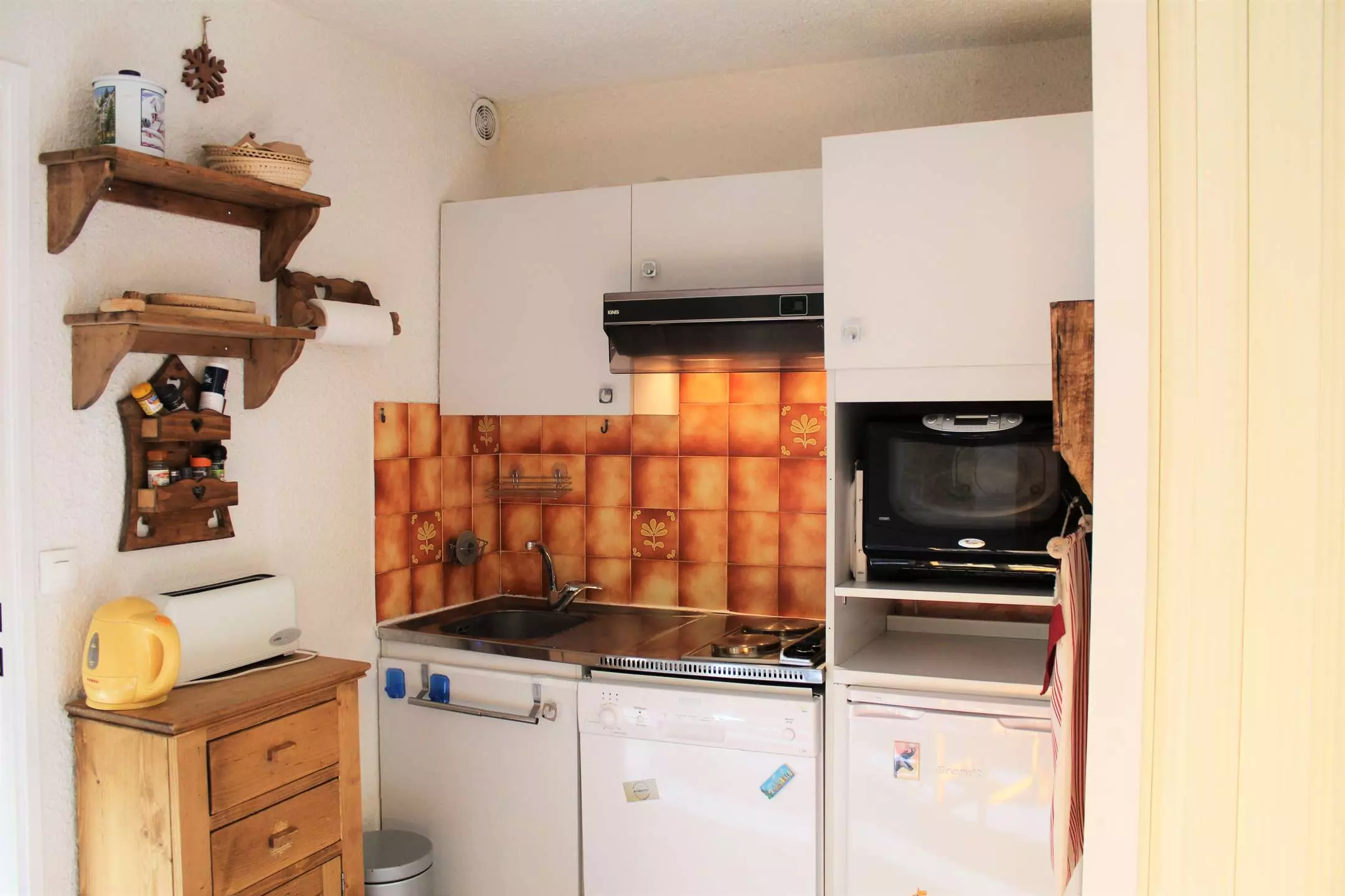 L'appartement se compose d'un coin cuisine équipée, d'un séjour avec un canapé convertible deux places, d'un coin montagne dans l'entrée avec un lit une place (isolé par une porte accordéon) et d'une salle d'eau avec WC.