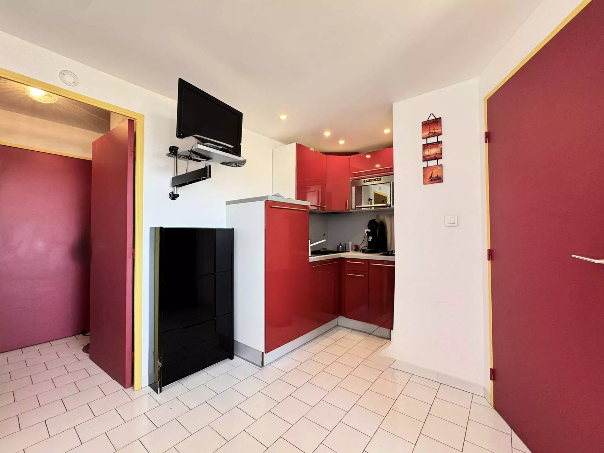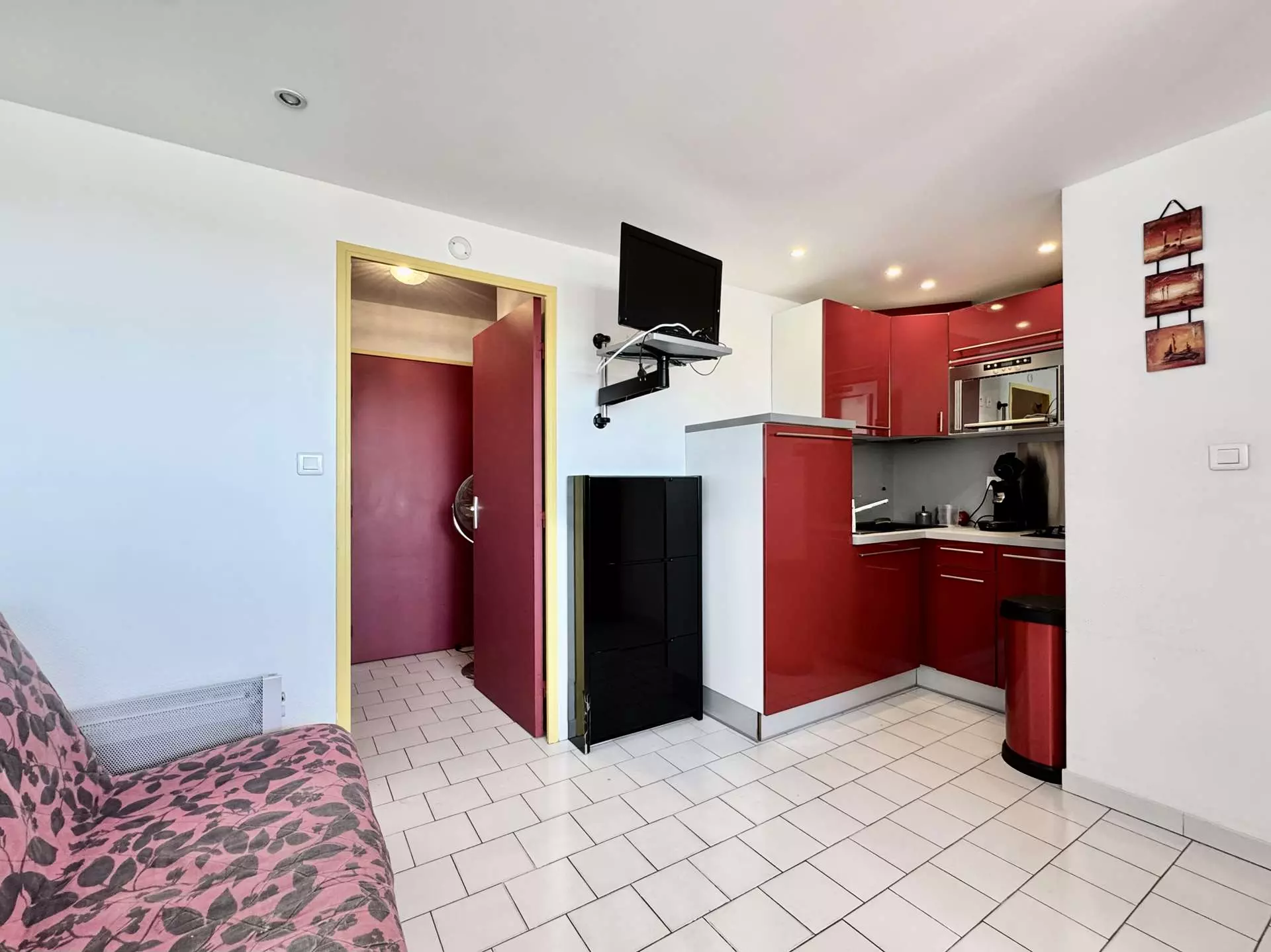 Coin cuisine : frigo-congélateur / micro-ondes / lave-linge / lave-vaisselle / cafetière Senseo / Grille-pain Séjour avec télévision et clic-clac.