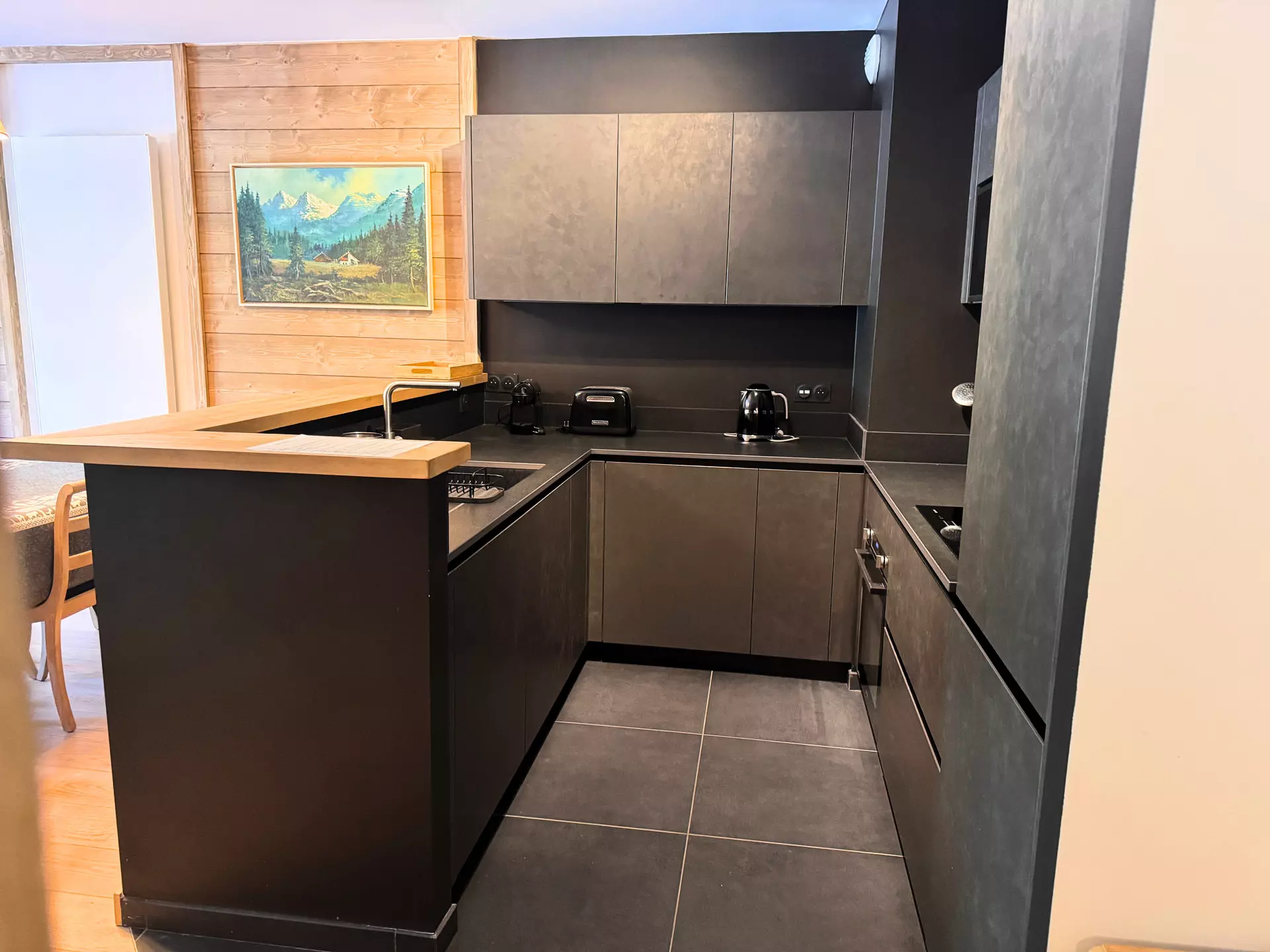 Une cuisine entièrement équipée avec plaques induction, hotte aspirante, four traditionnel, four micro-ondes, frigo, congélateur, lave-vaisselle et lave-linge.