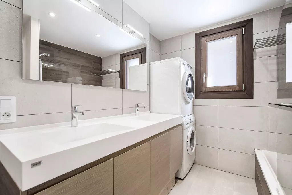- Salle de bain : baignoire, sèche serviette, 1 wc, double vasques, sèche-linge, lave-linge