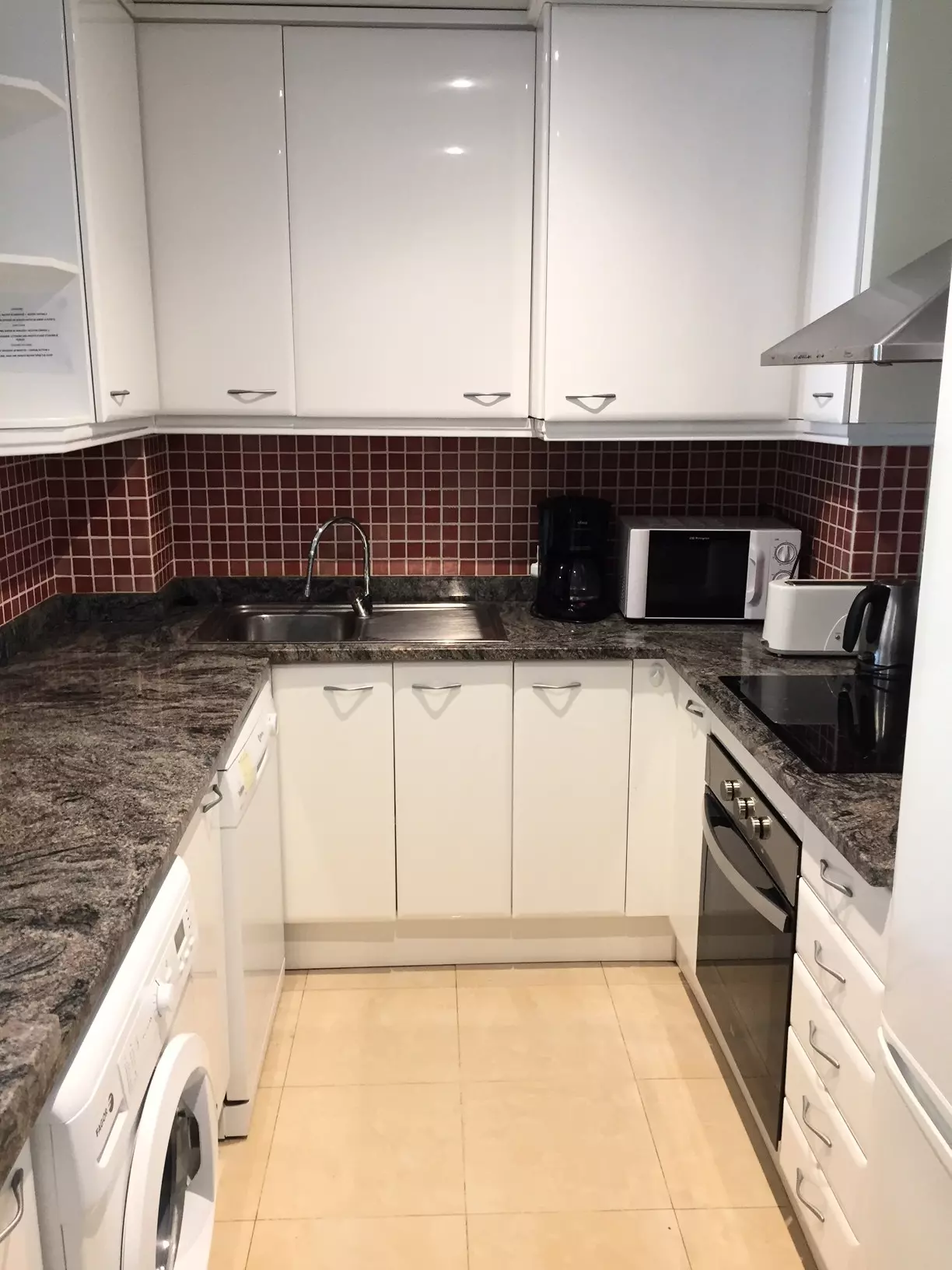 La cuisine américaine, avec une plaque vitrocéramique, est entièrement équipée avec un réfrigérateur, un micro-ondes, un four, un congélateur, une machine à laver, un lave-vaisselle, ainsi que de la vaisselle, des couverts, des ustensiles de cuisine, une cafetière, un grille-pain, un fer à repasser, une bouilloire et un presse-agrumes.
