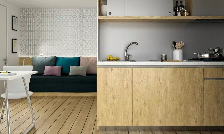 - coin cuisine : réfrigérateur, plaque de cuisson, cafetière, bouilloire, micro-onde, lave-vaisselle, grille-pain