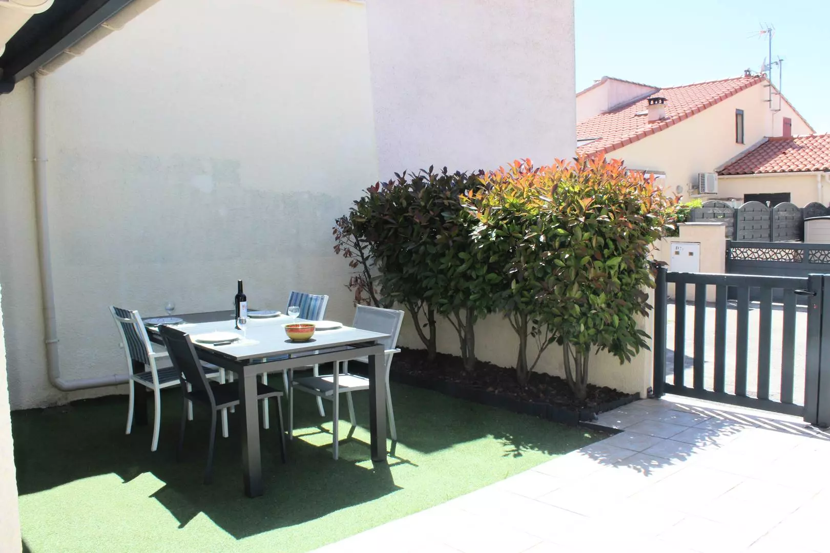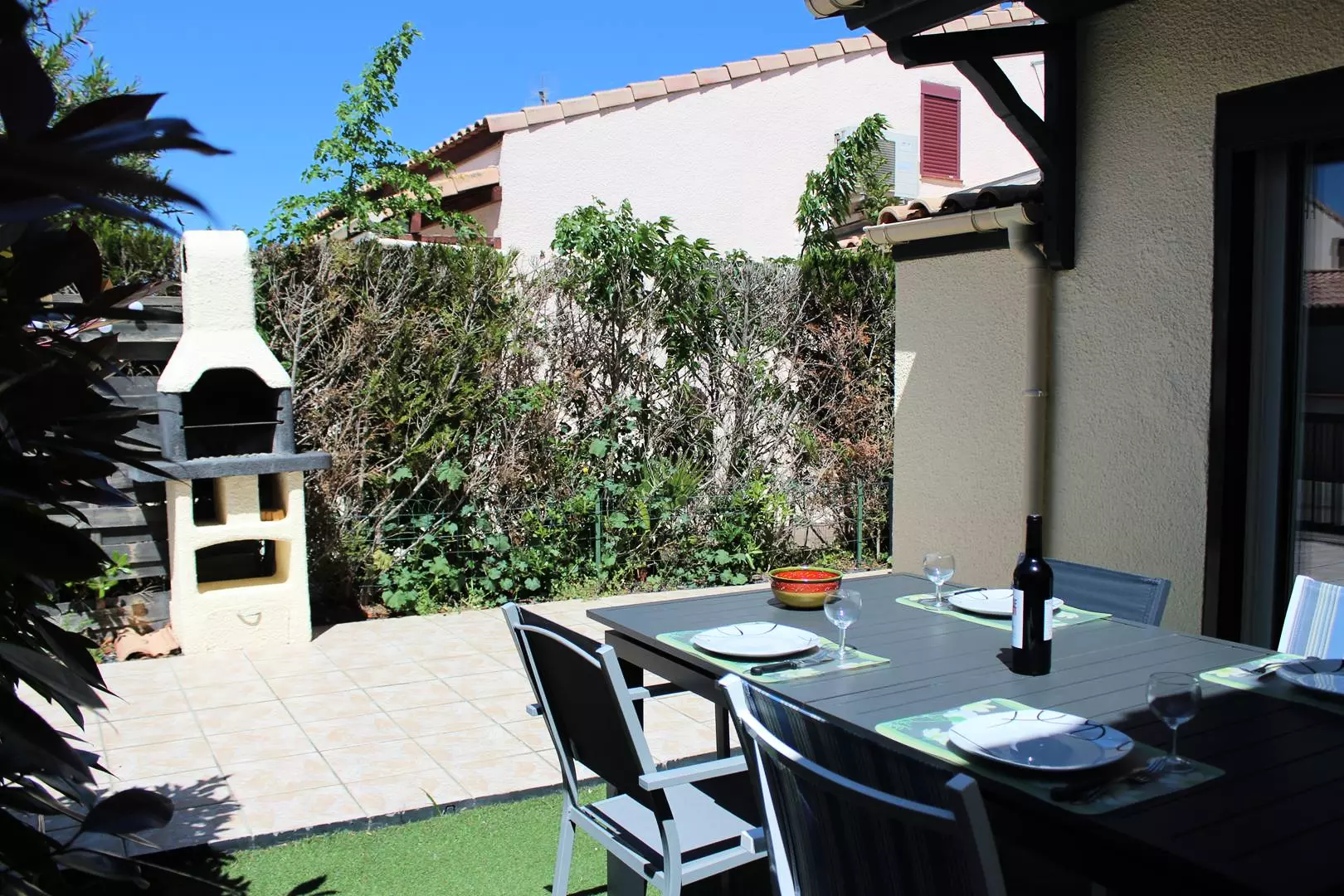 Cour fermée avec barbecue,salon de jardin et parasol (Haie végétale qui vous permettra de prendre vos repas à l'abri des regards)