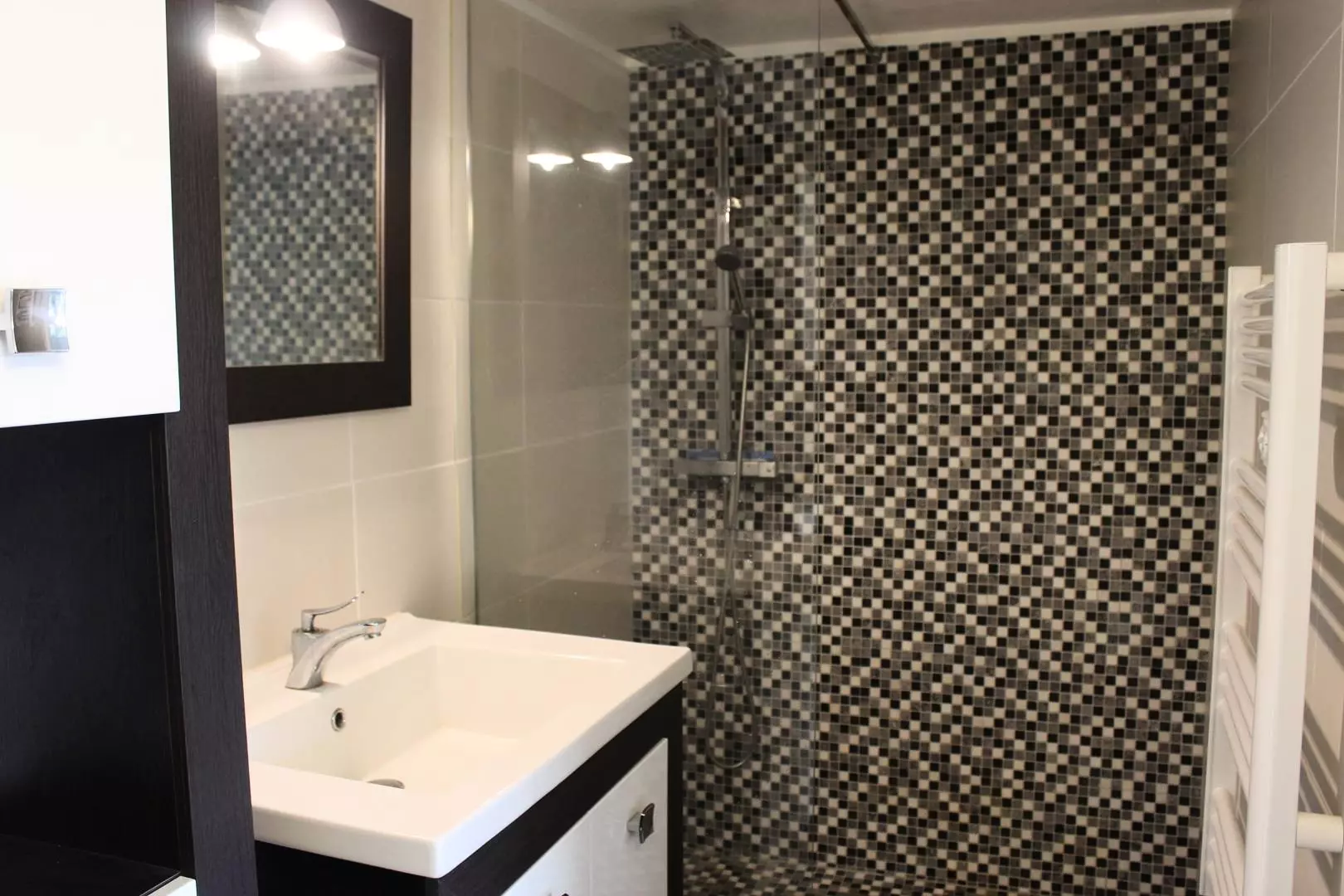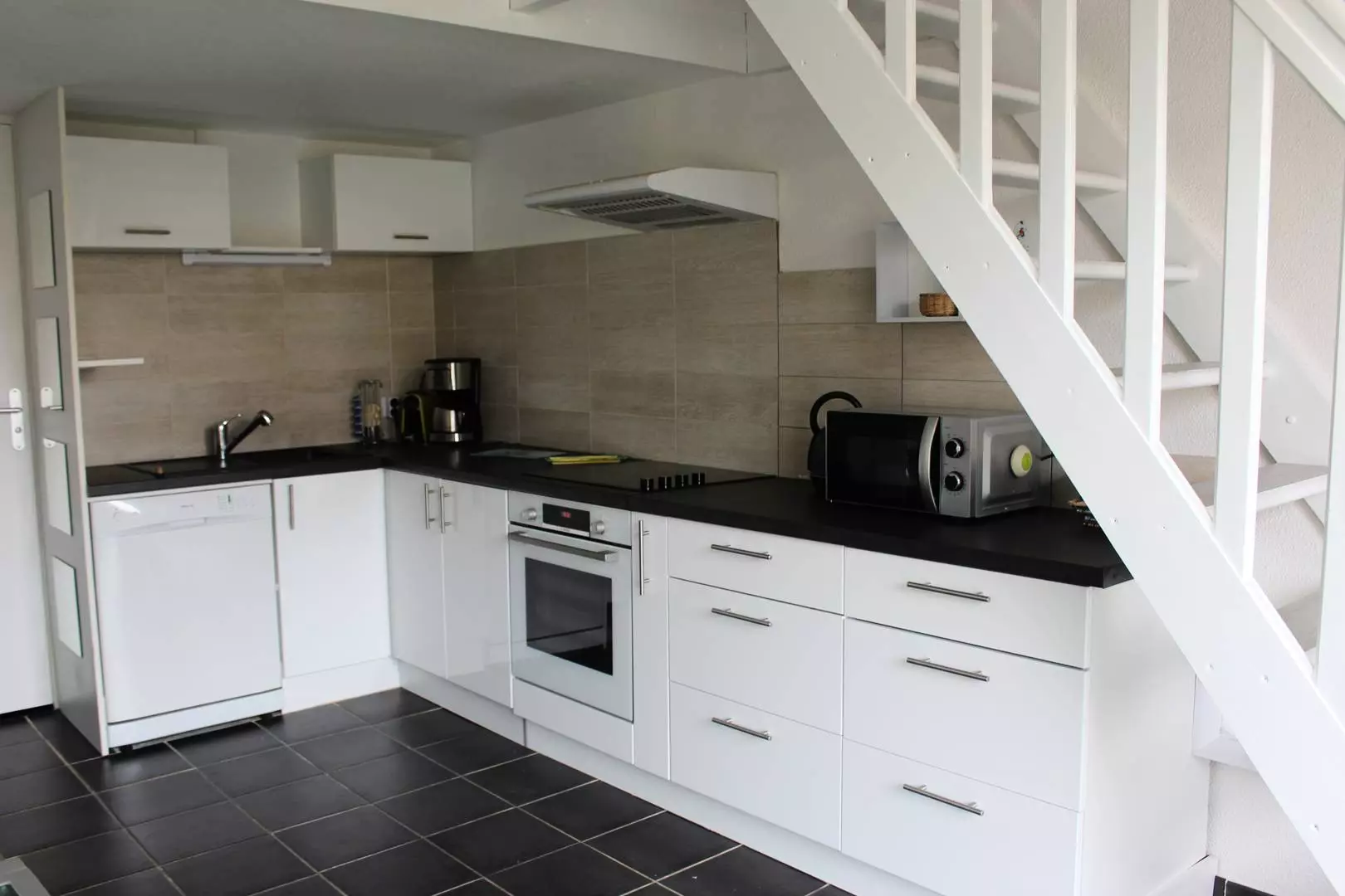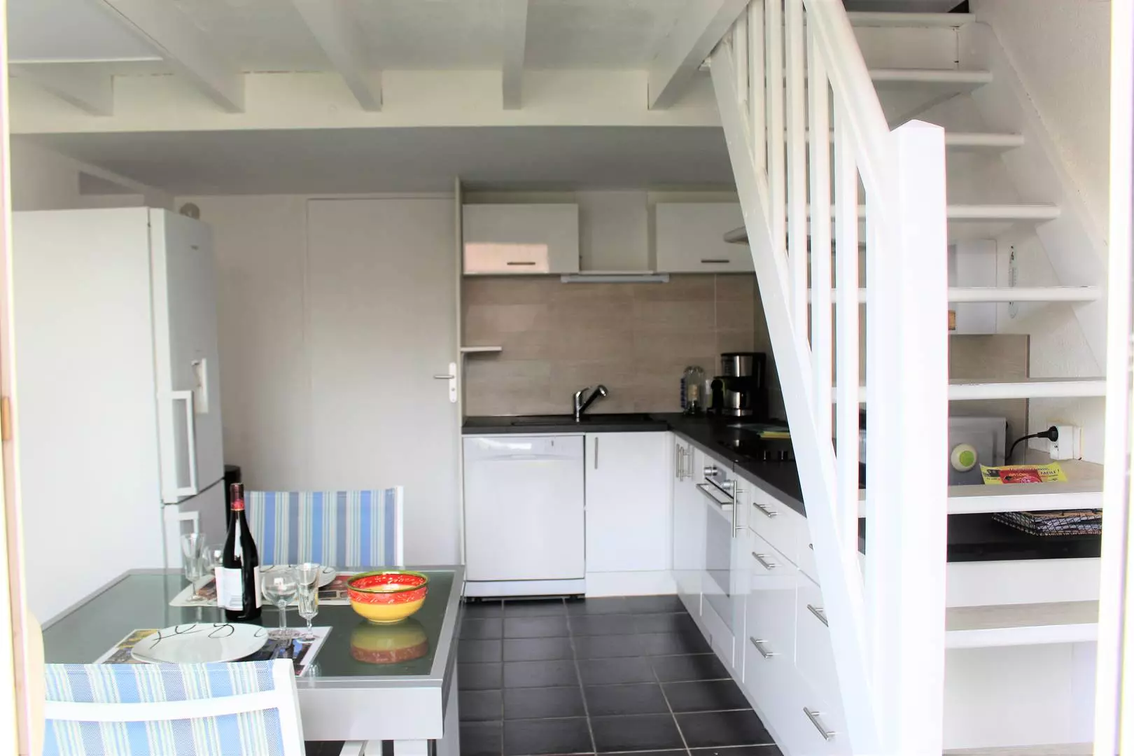 Entrée directe dans le séjour avec coin repas / cuisine ouverte équipée (réfrigérateur / congélateur, plaque vitrocéramique, four,micro ondes,lave vaisselle ...)
