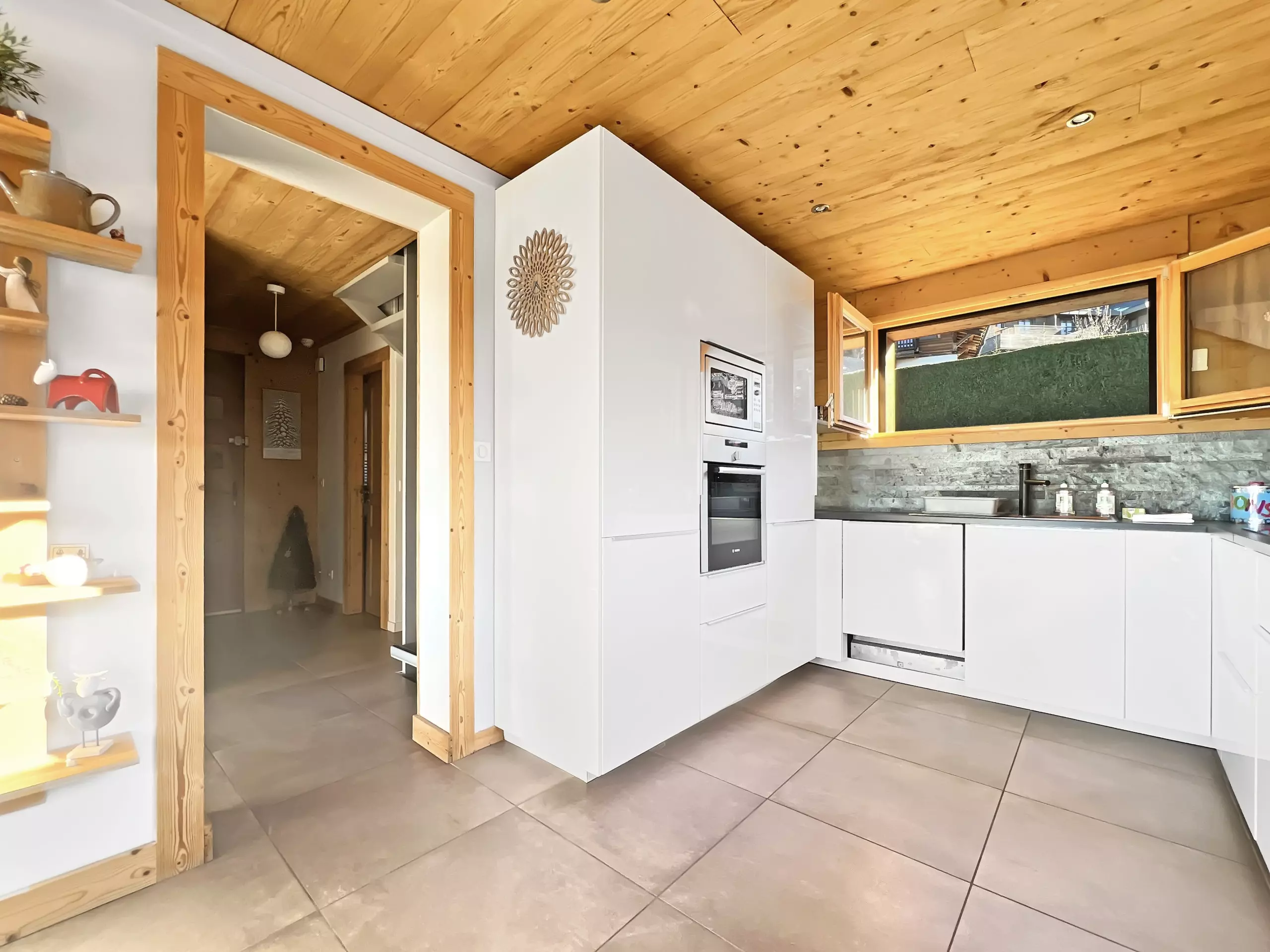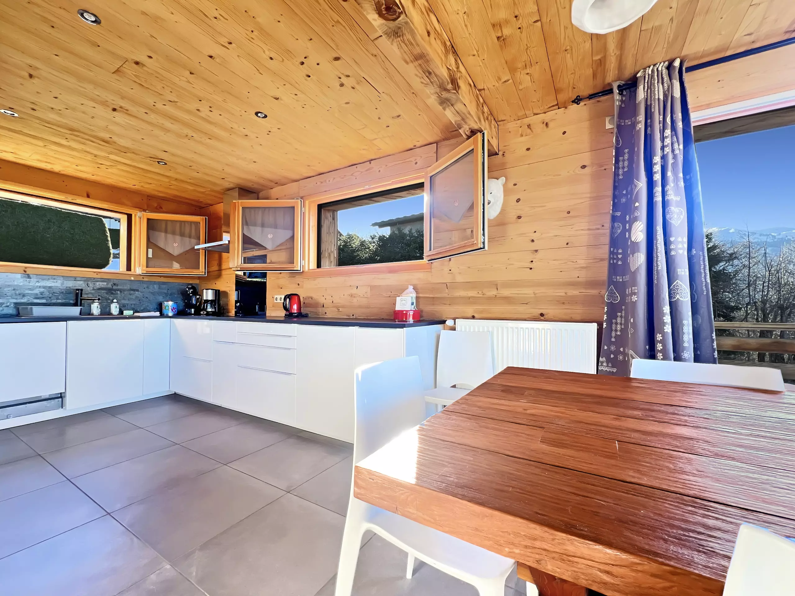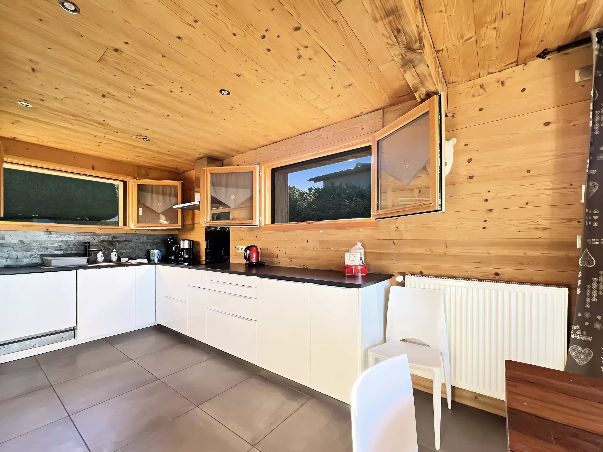 cuisine ouverte sur séjour / salon (four, micro ondes, lave vaisselle, 3 plaques induction, hotte, frigo/congèl, cafetière à filtre, Senseo, appareil à raclette, à fondue et pierrade)