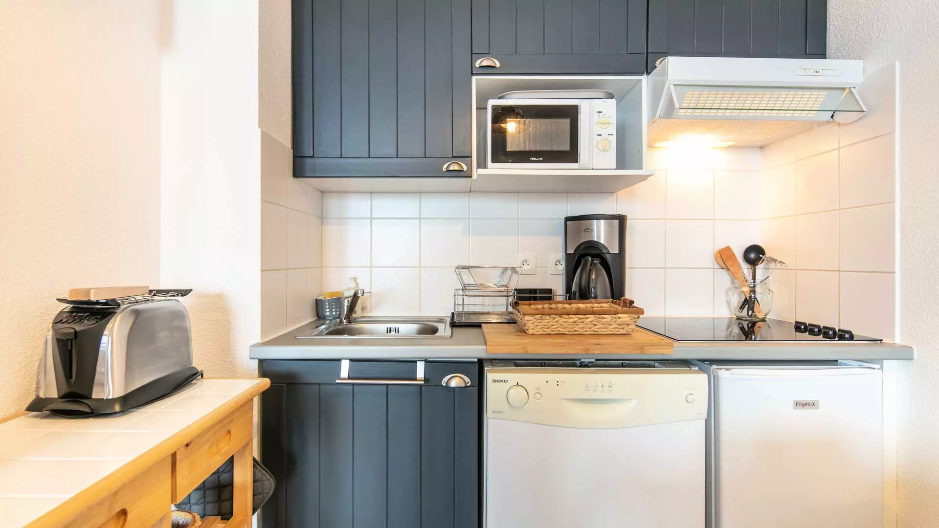 - Cuisine équipée (réfrigérateur, congélateur, lave-vaisselle, micro-ondes, vaisselle/couverts, cafetière, bouilloire, grille pain et ustensiles de cuisine).