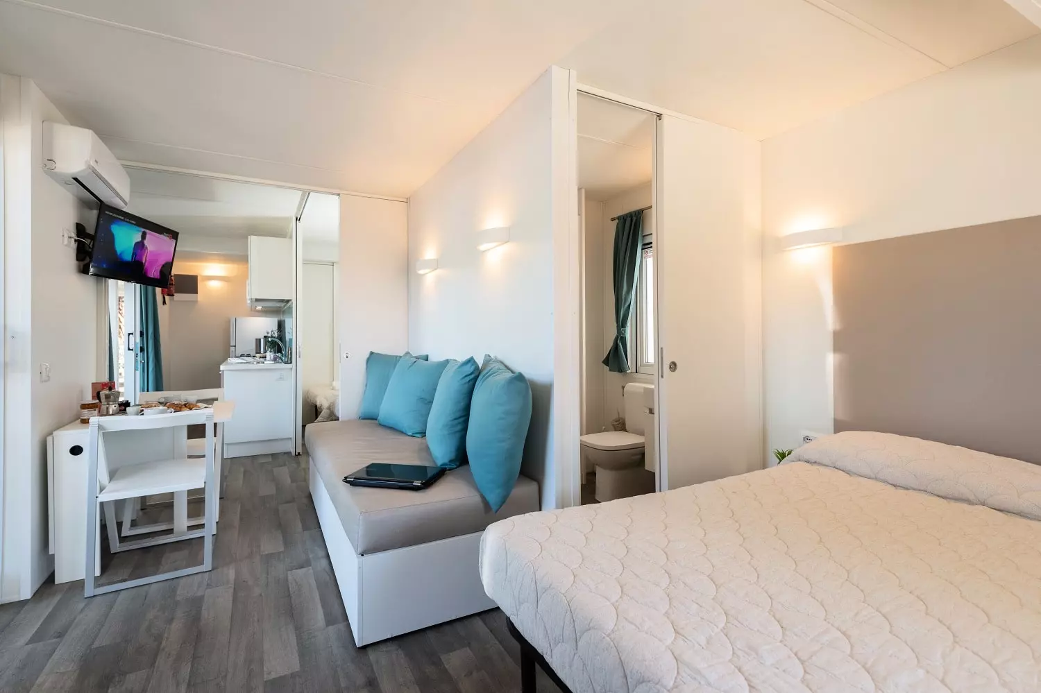 Le Mobil-home Venere présente un salon spacieux avec kitchenette entièrement équipée, colonne frigo et canapé confortable, 2 chambres doubles, dont une avec lit-couchette, et 2 salles de bains complètes, dont une avec bidet. L'équipement compte également air conditionné et TV.