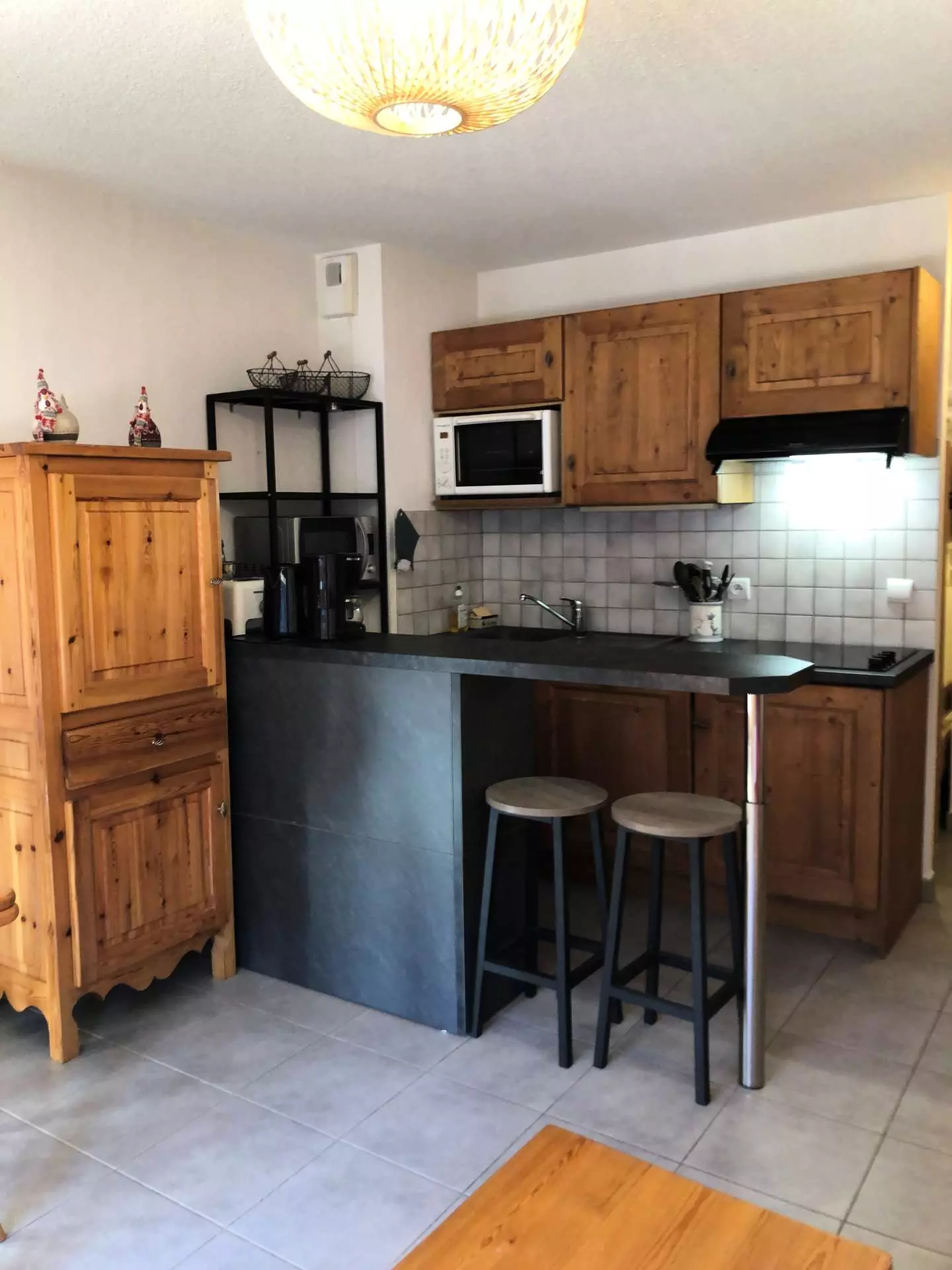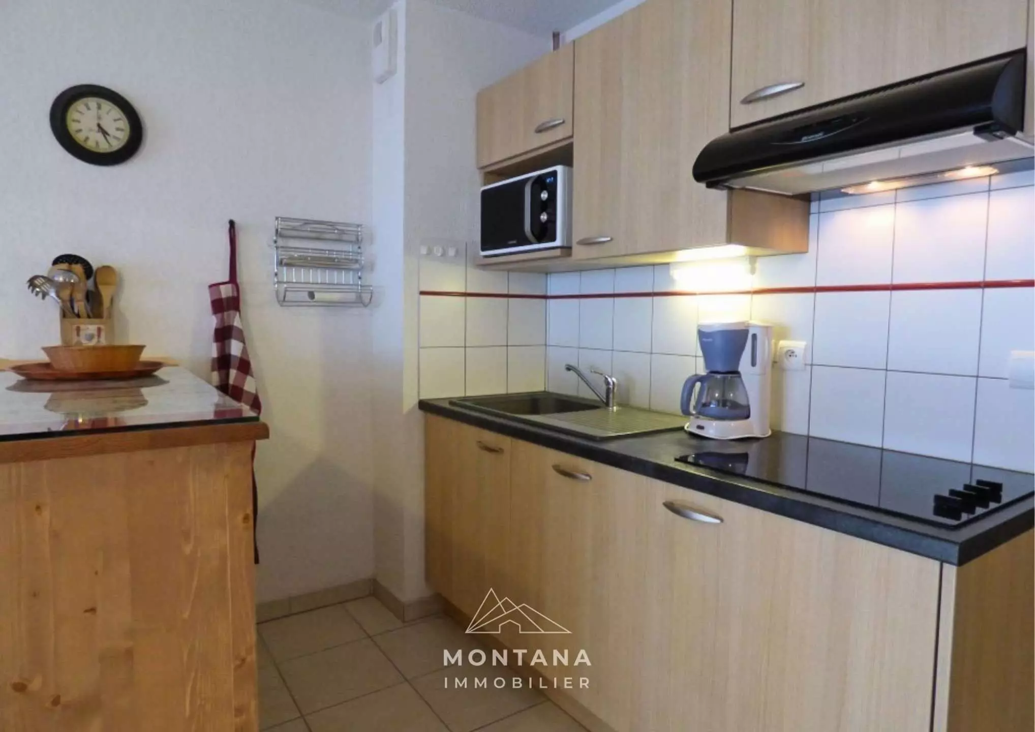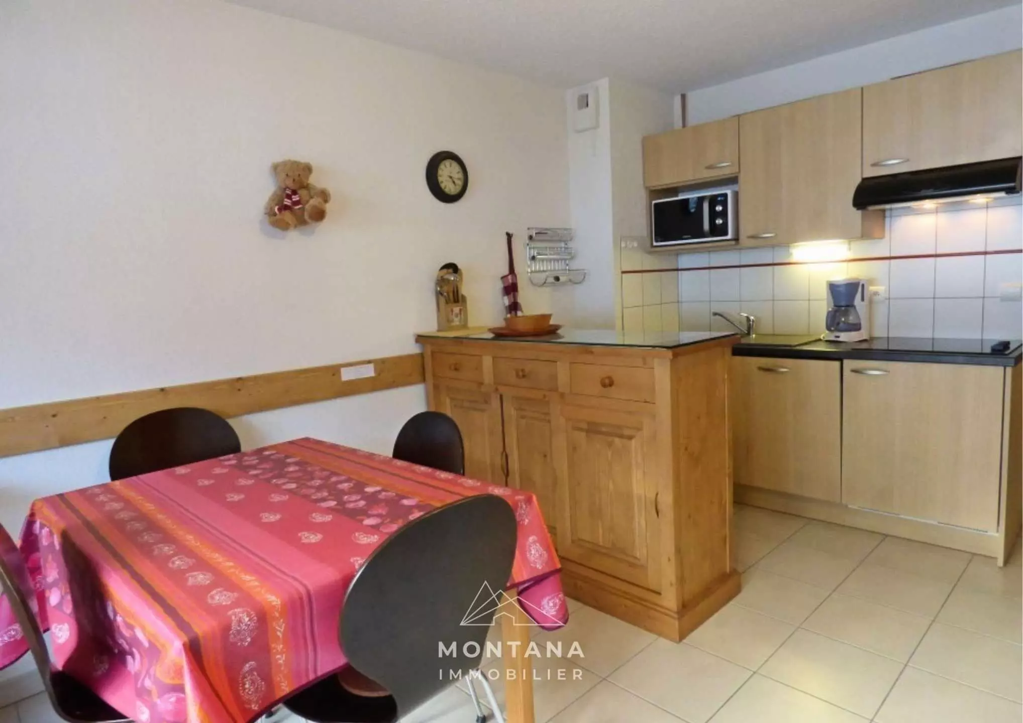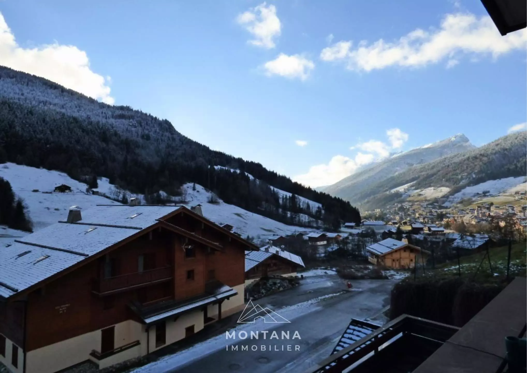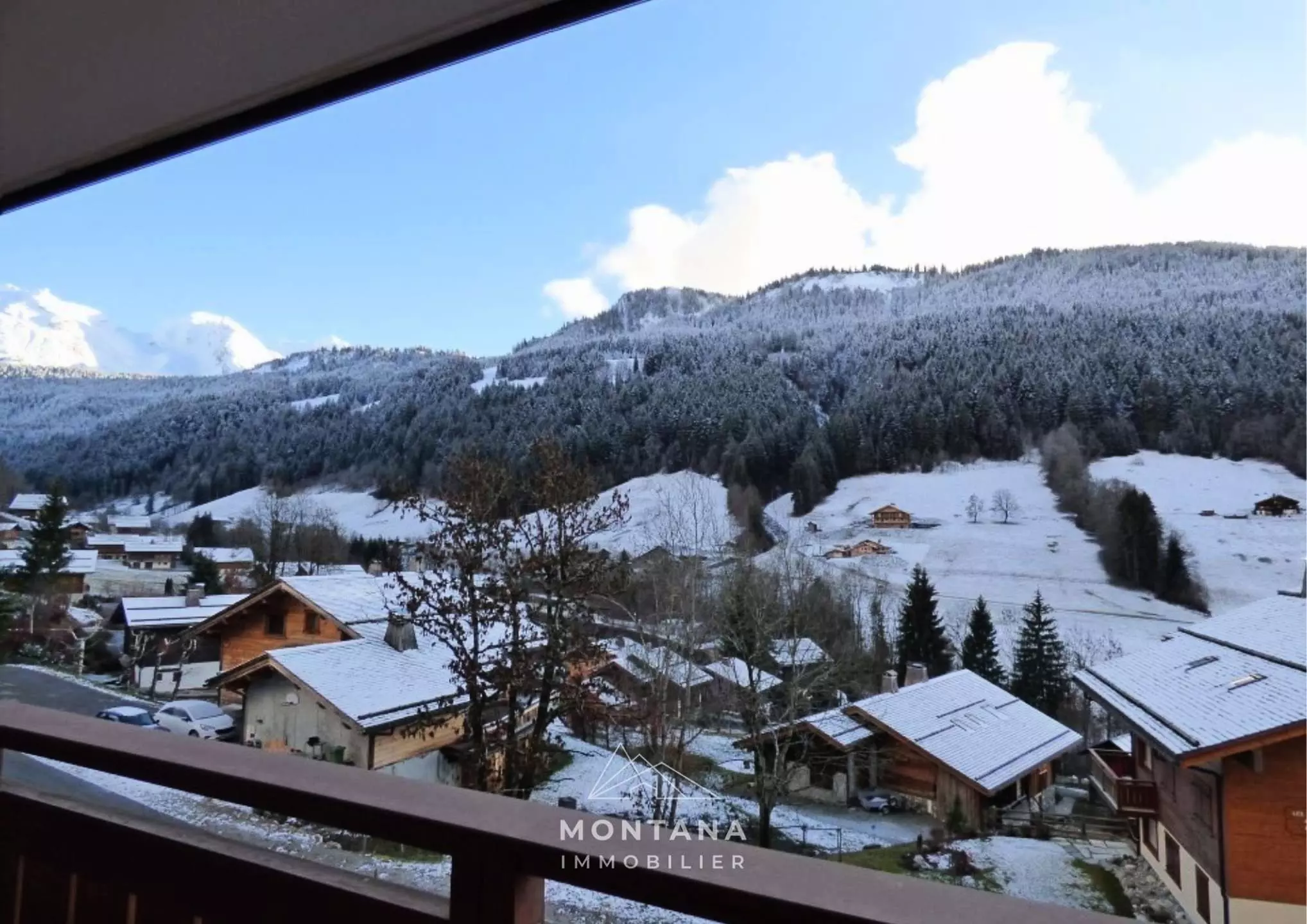 Chaleureux appartement offrant une cuisine ouverte sur séjour, grande terrasse plein SUD avec superbe vue sur le Massif des Aravis et le village !