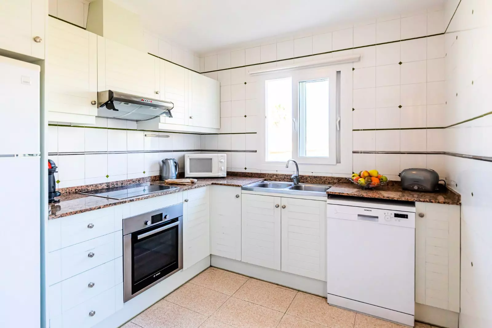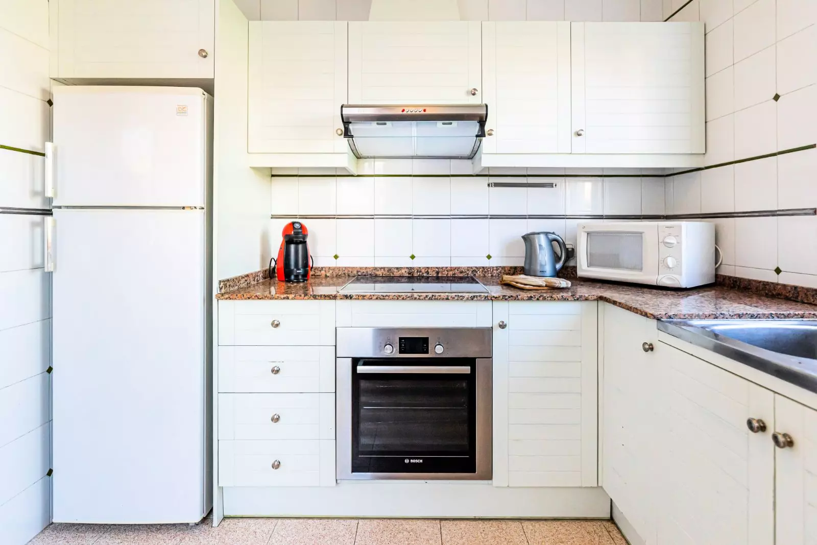 La cuisine est entièrement équipée d'appareils électroménagers modernes tels que lave-linge, lave-vaisselle, four, micro-ondes, cafetière et autres ustensiles nécessaires pour préparer des repas. De plus, elle dispose de la climatisation dans tout le logement et du WiFi pour rester connecté.