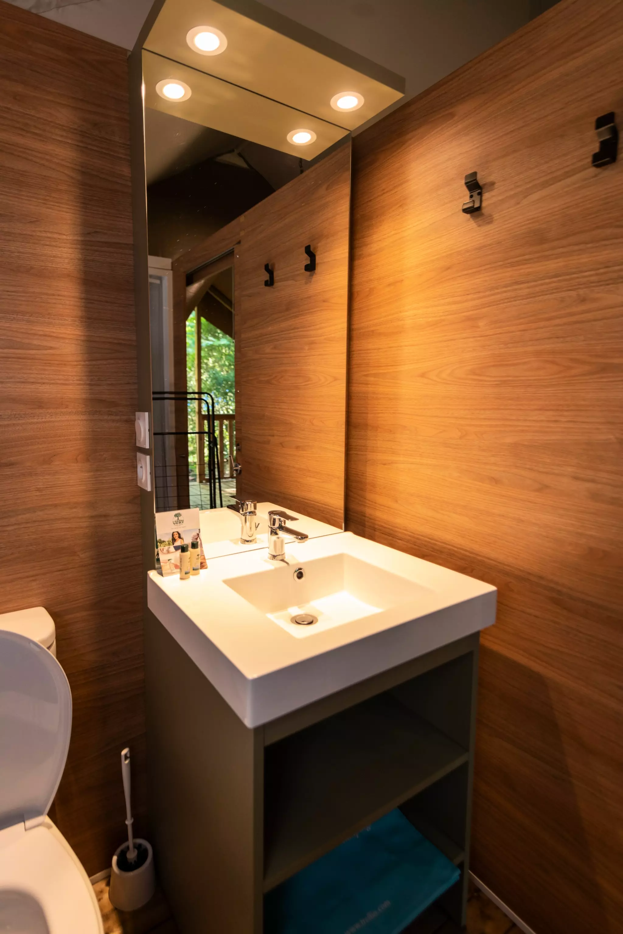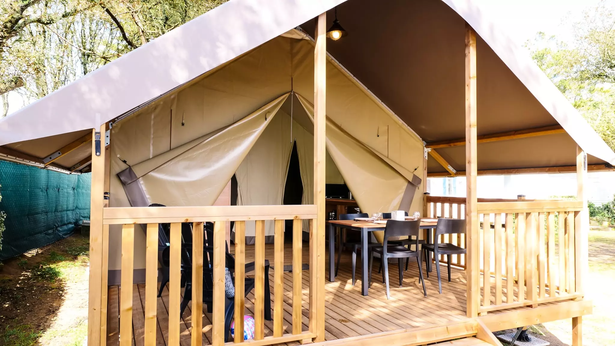 Lodge : toile de tente aménagée sur plancher en bois. 24 m² 4 personnes maximum (idéal pour : 2 adultes + 2 enfants). Salle d'eau avec WC et douche + lavabo