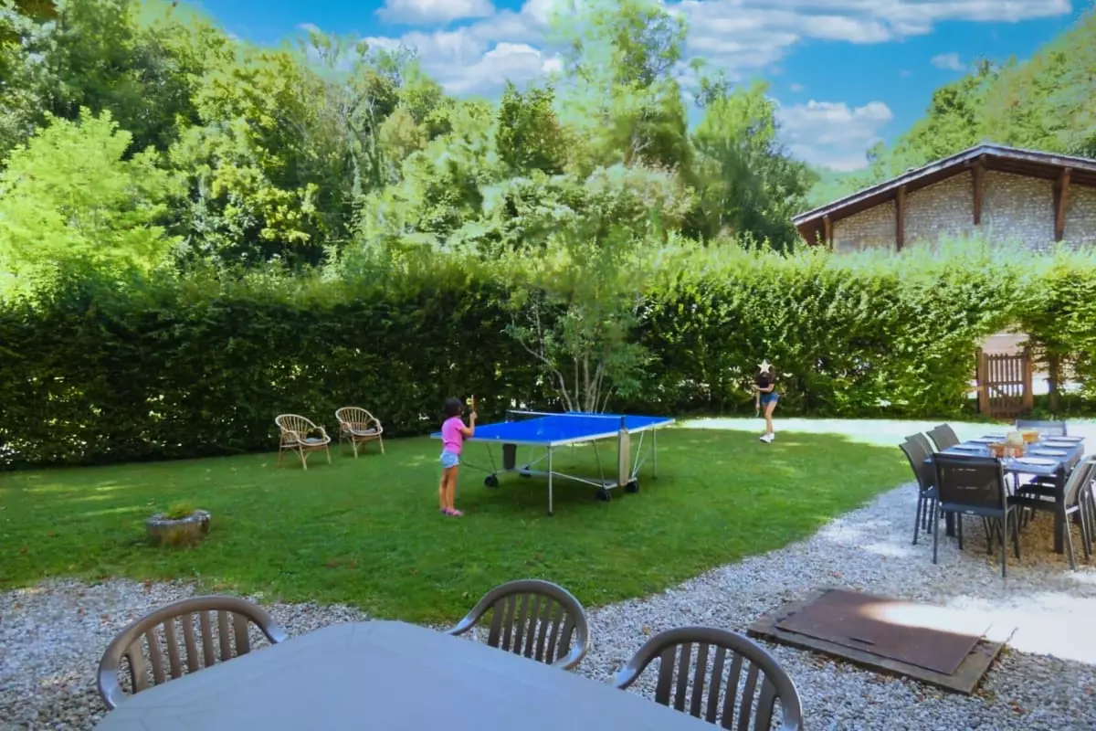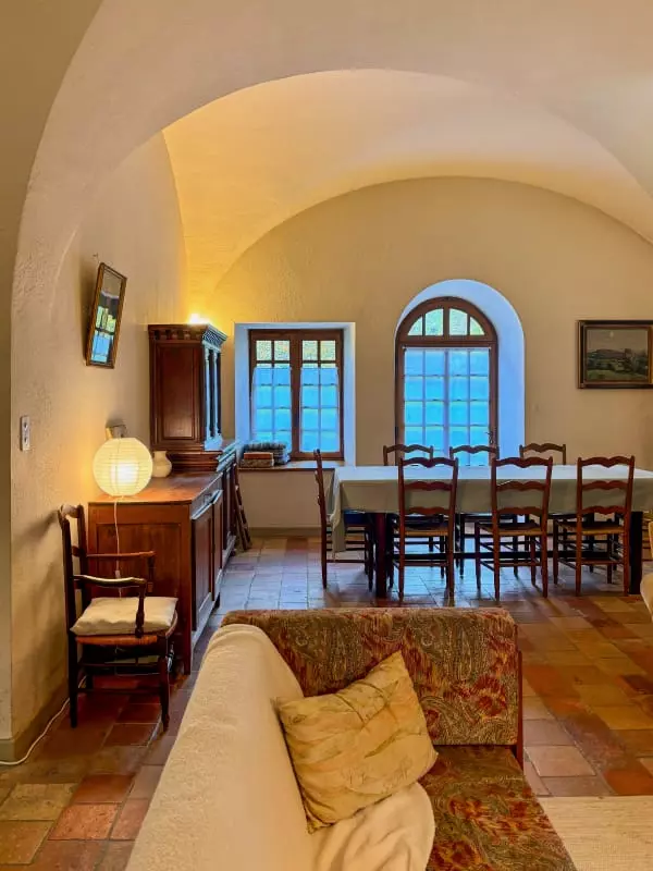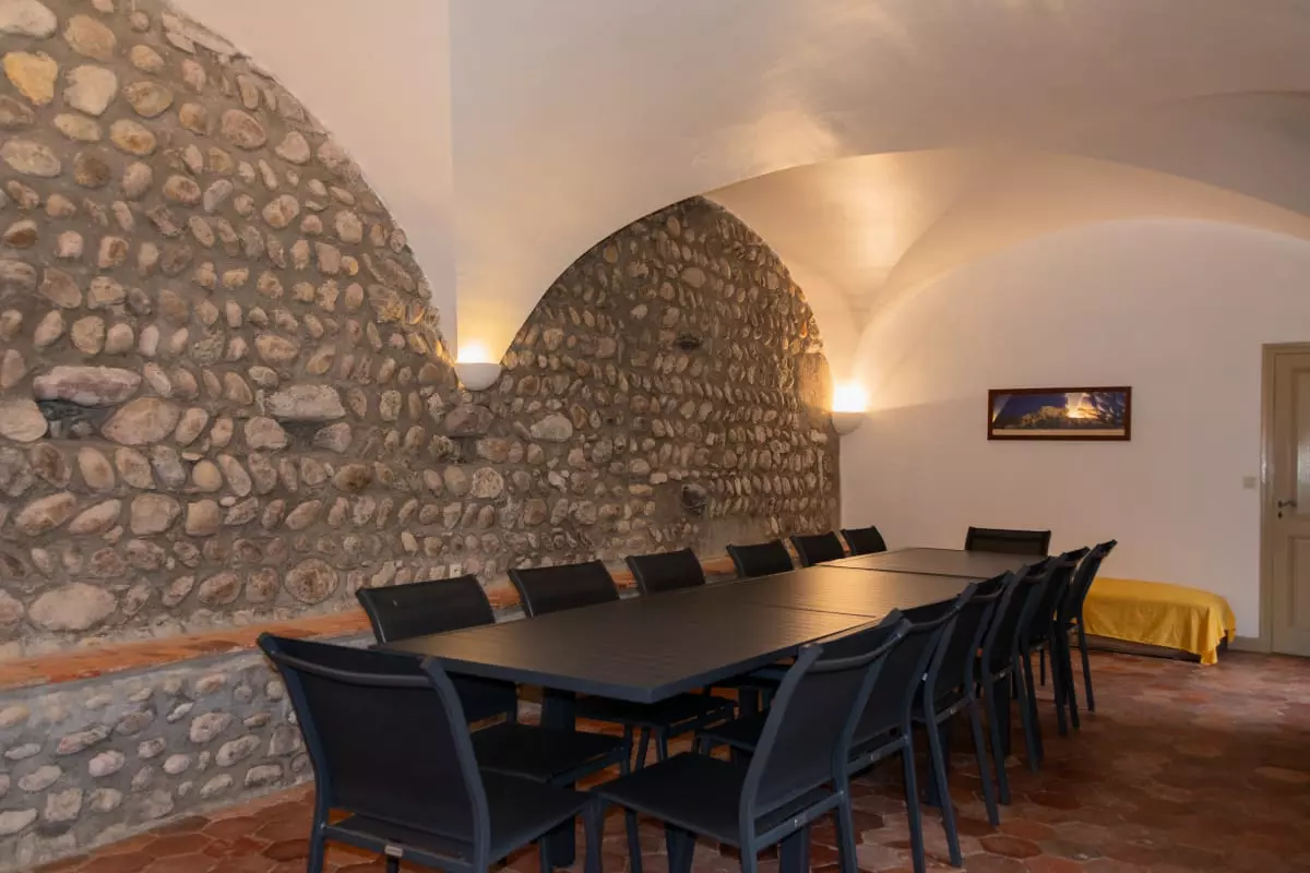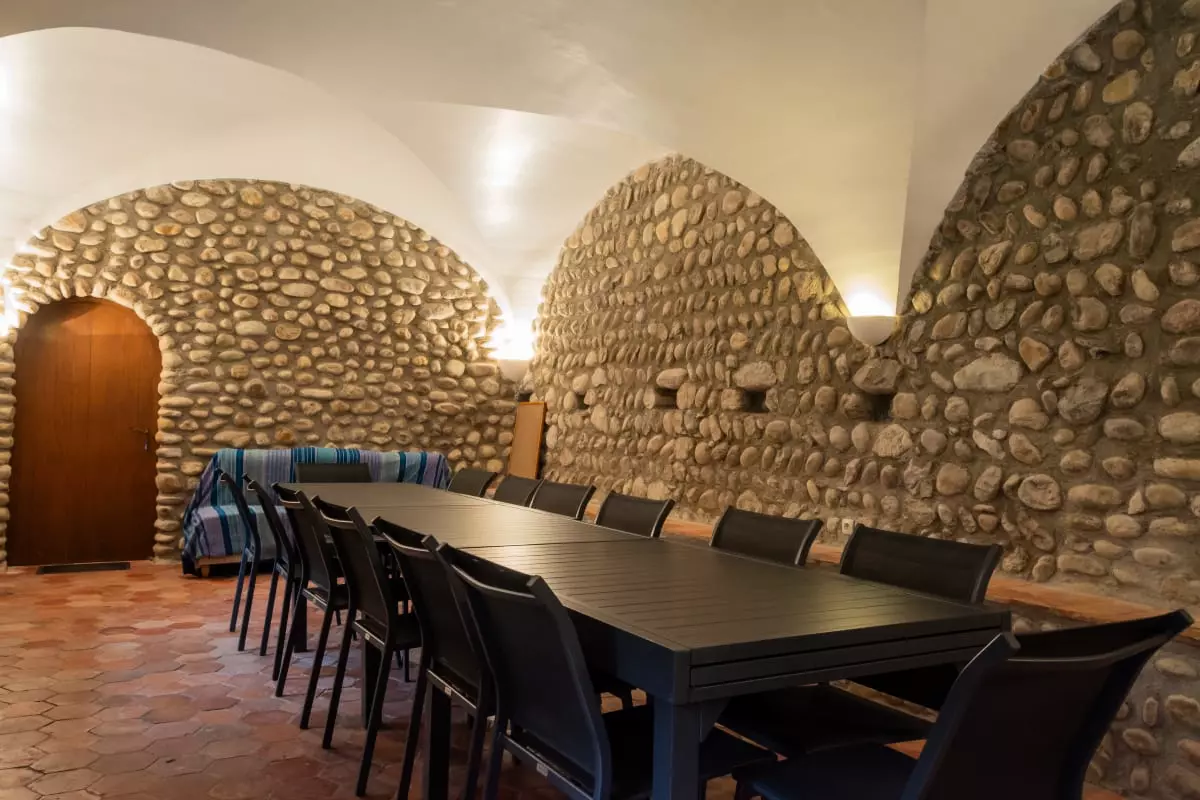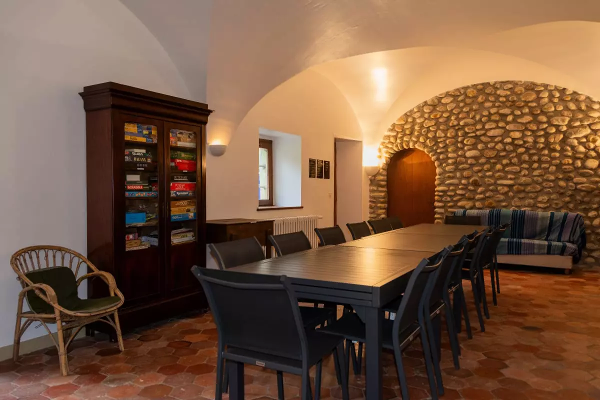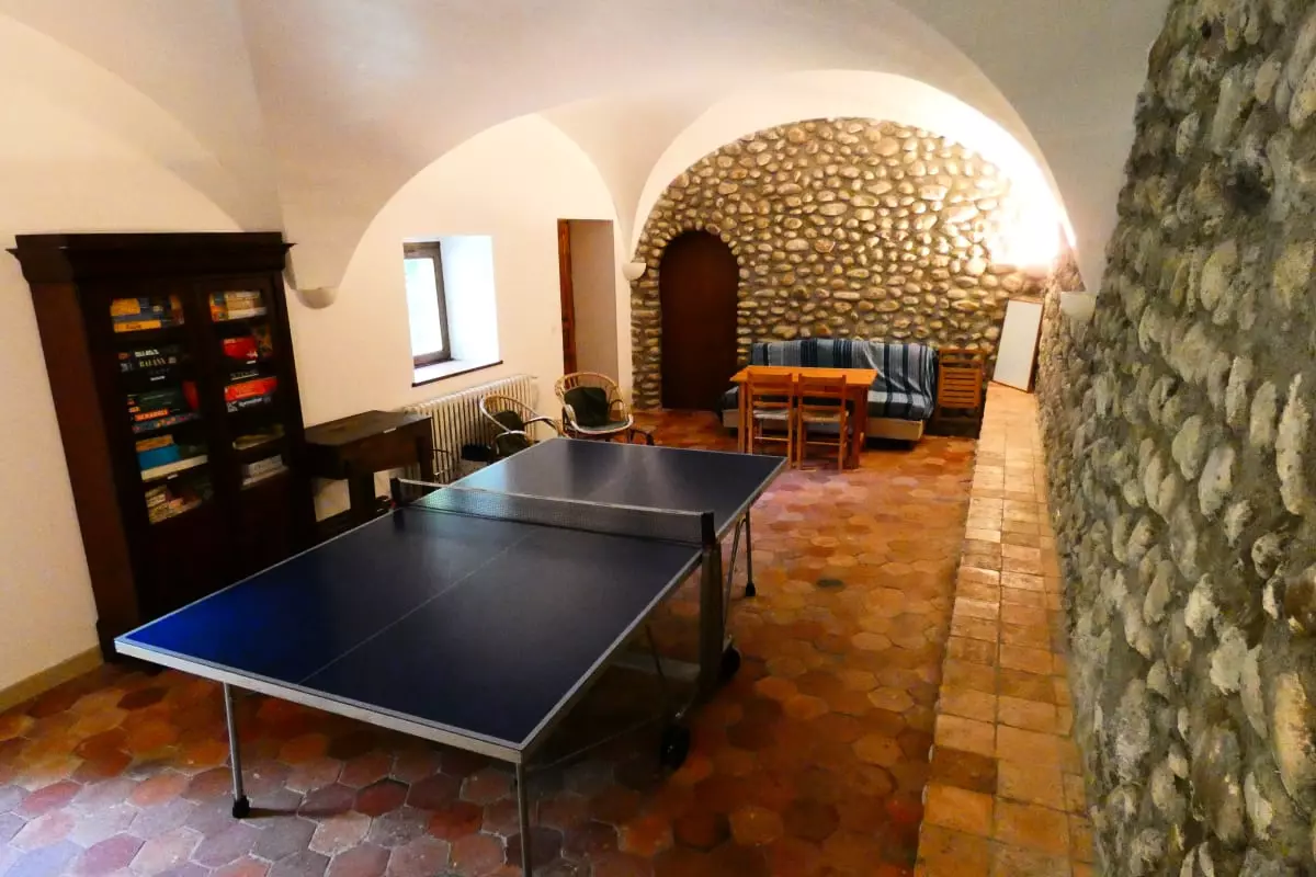 Dès l’entrée, vous serez séduit par la salle voûtée. Avec ses dimensions confortables de 9 mètres de long par 4 mètres de large, vous pourrez y organiser vos réunions (accès WIFI), vos activités de groupe, vos repas (tables et chaises pour 20 personnes), vos parties de tennis de table, selon la thématique de votre séjour.