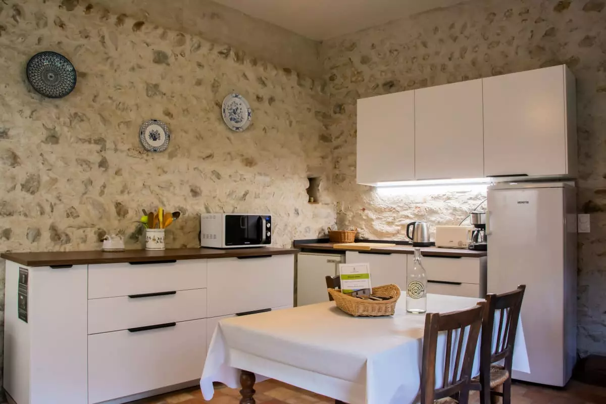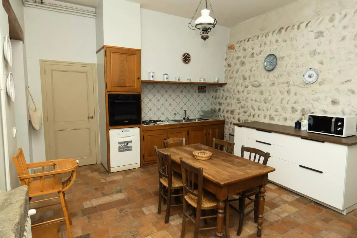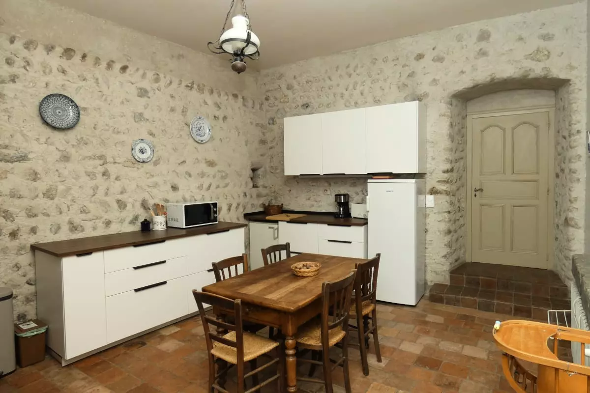 Cuisine et salle voûtée ouvrent sur l’extérieur permettant durant la belle saison d’accéder directement au jardin du gîte et de profiter de repas conviviaux en extérieur.