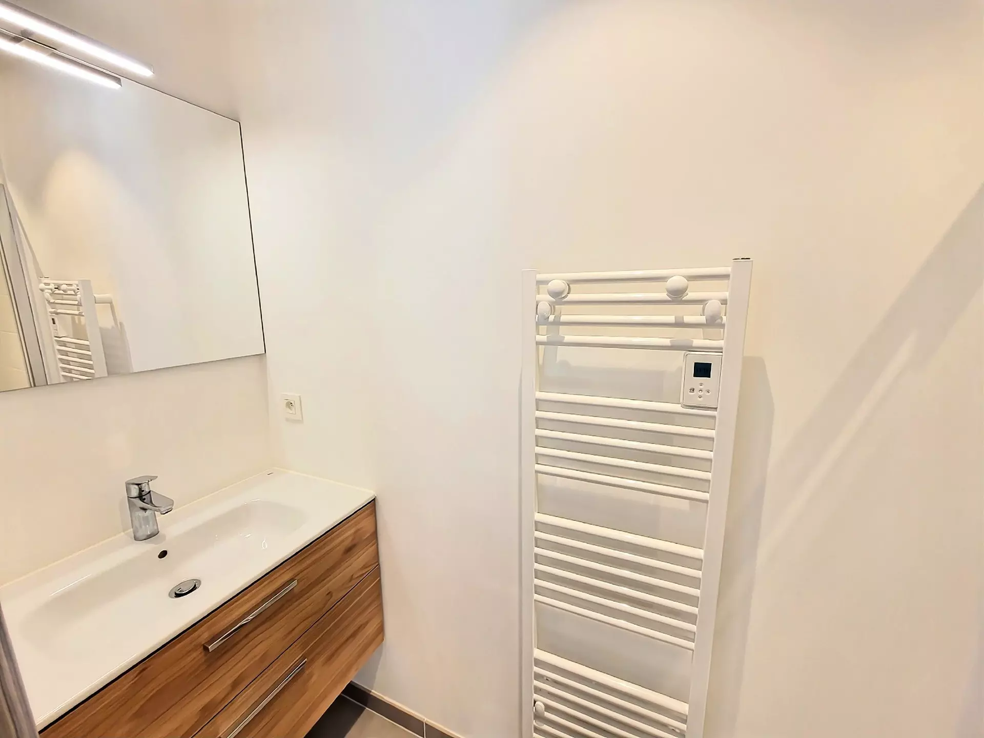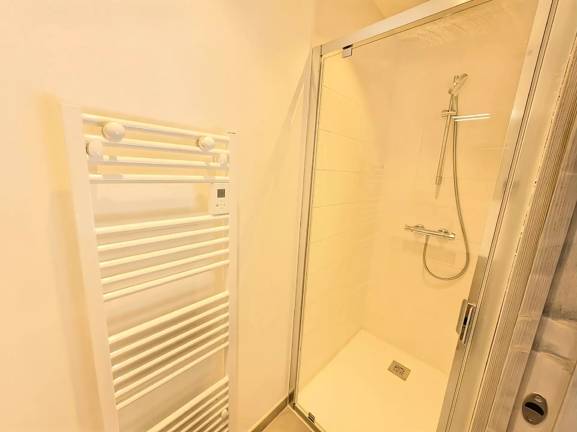 - Une salle de douche avec vasque, sèche serviettes, bac à douche