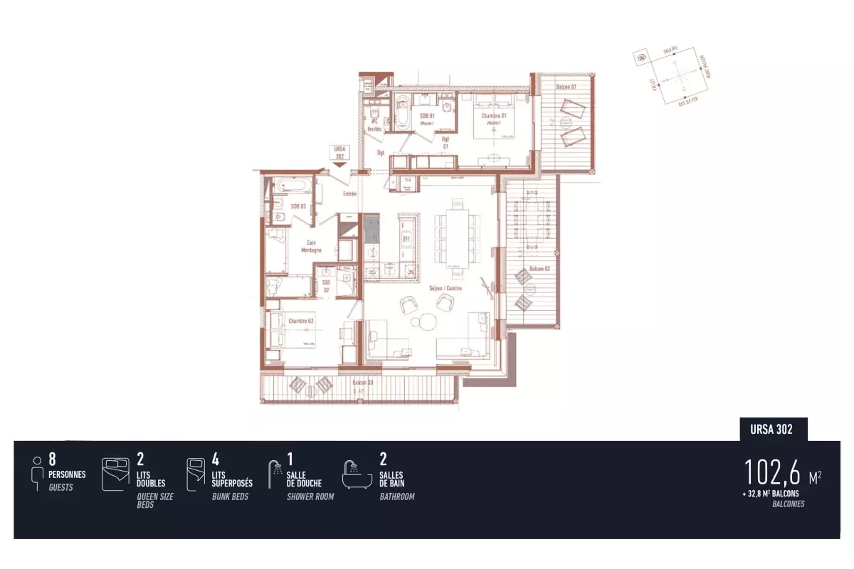D’un coté, une grande pièce de vie ouverte sur la terrasse ensoleillée pour les instants de convivialité. De l’autre, 2 chambres doubles en suite, ainsi qu’un coin montagne à l’écart doté de 4 lits superposés pour le plus grand bonheur des petits ou des plus grands.