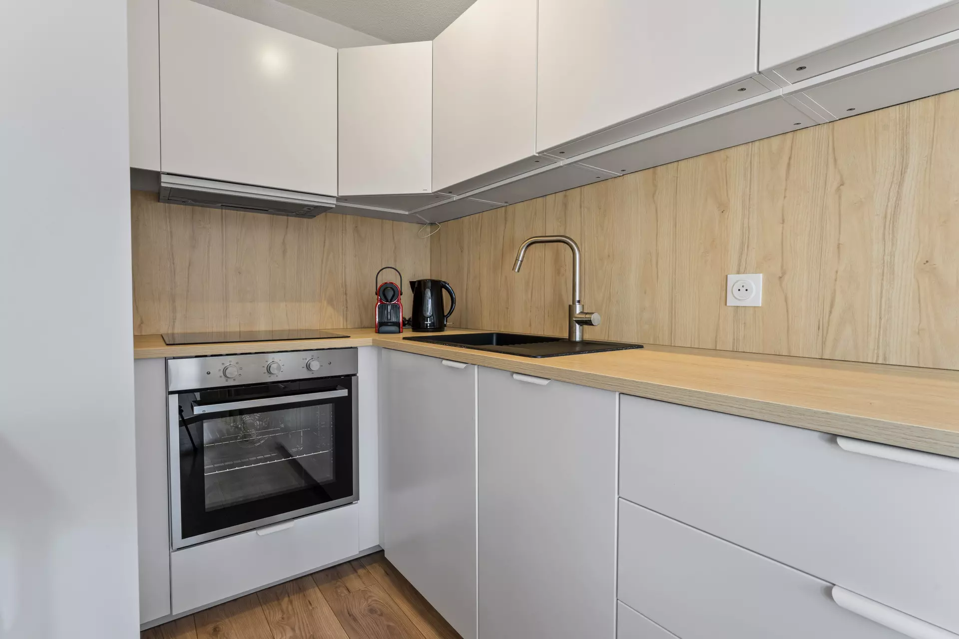 Dans le séjour, vous trouverez une cuisine moderne et toute équipée : cafetière Nespresso, un four traditionnel, une bouilloire.