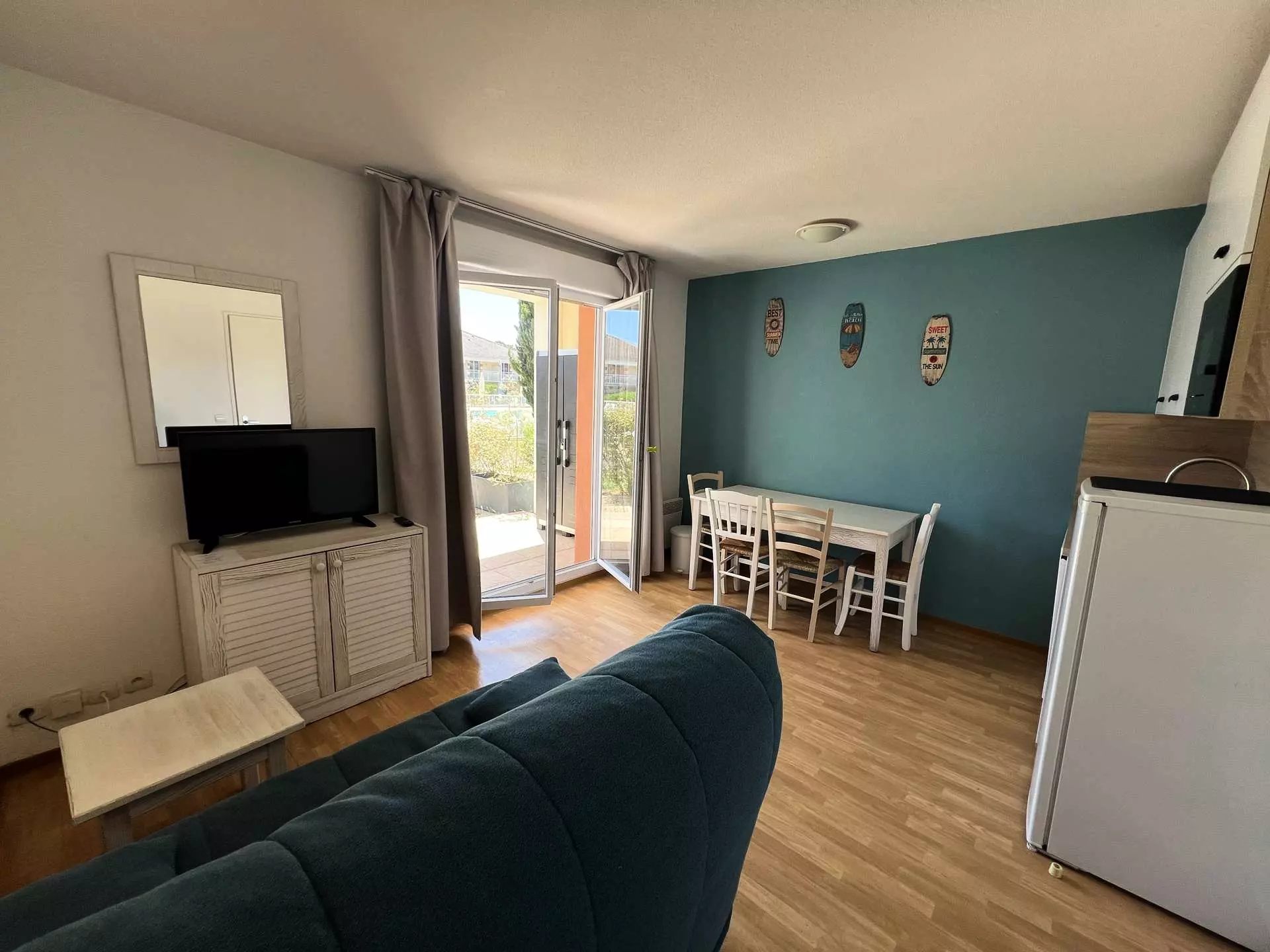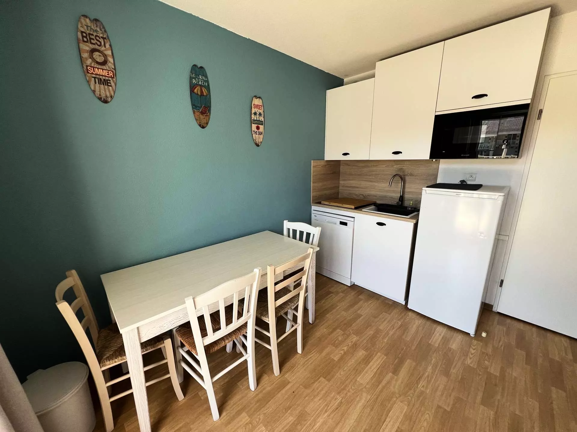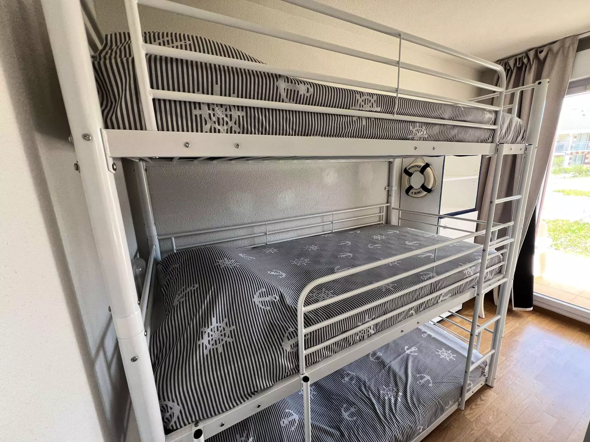 L'appartement se compose d'une entrée accueillante, une pièce à vivre avec sa cuisine équipée, une chambre avec un lit double (140 cm) et rangements, une seconde chambre avec trois lits simples superposés (90 cm), parfaite pour les enfants, une salle d'eau moderne, un WC indépendant.