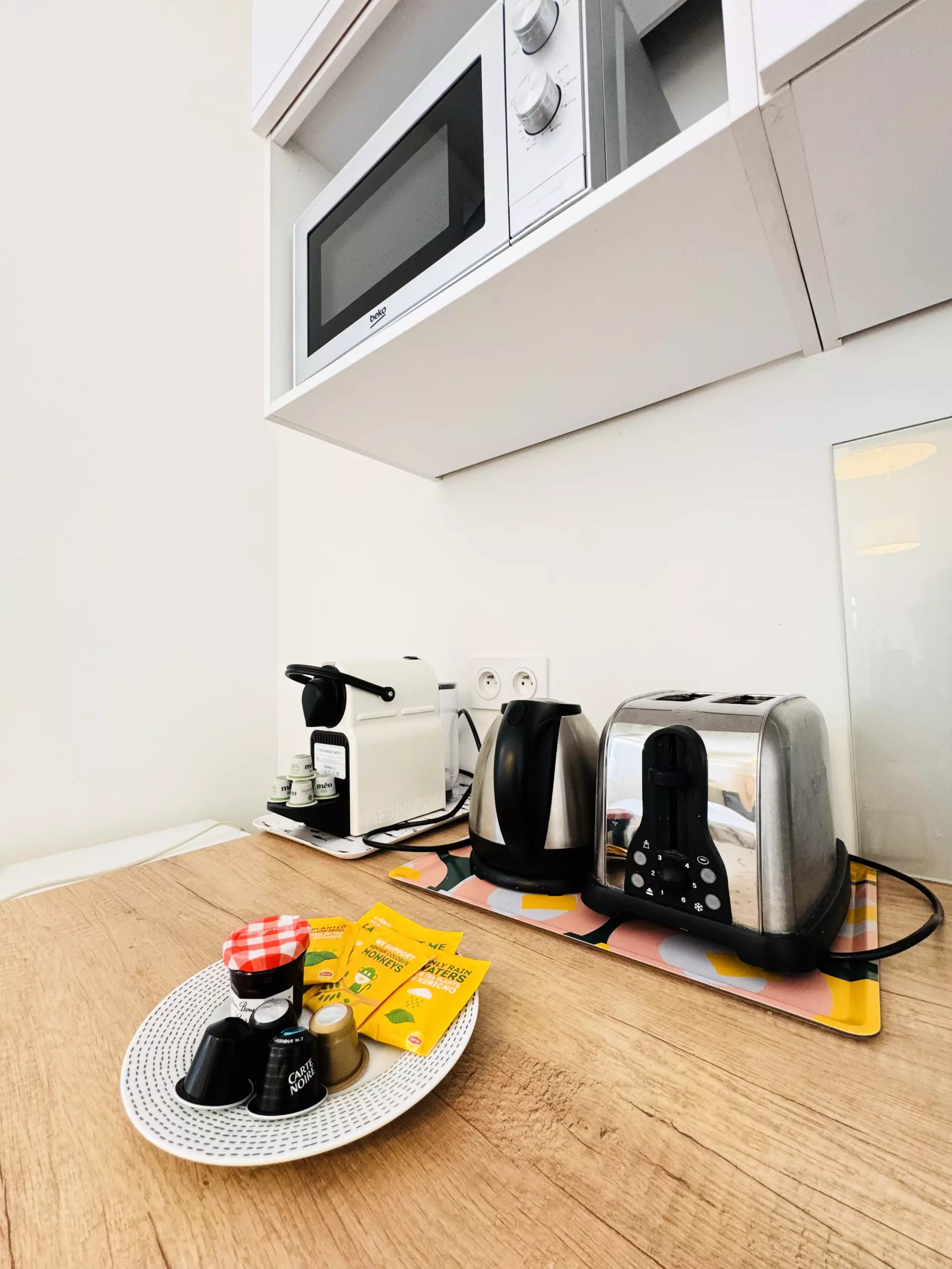 La partie cuisine est entièrement équipée avec un réfrigérateur, un four micro-ondes, une plaque électrique, une cafetière Nespresso, une bouilloire. La salle de douche avec WC est équipée d'un lave-linge pour plus de commodité.