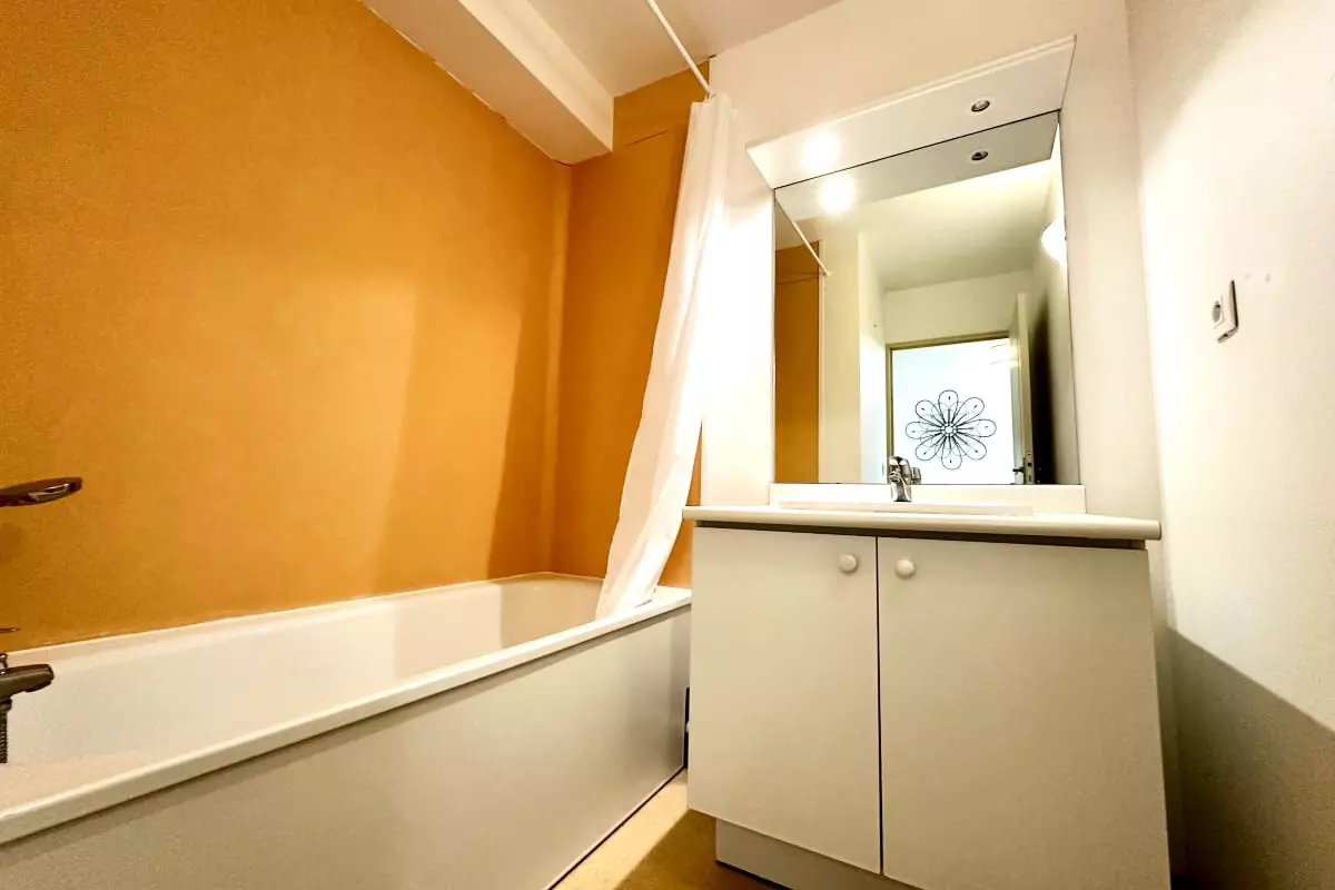 * Une salle de bain avec baignoire et simple vasque