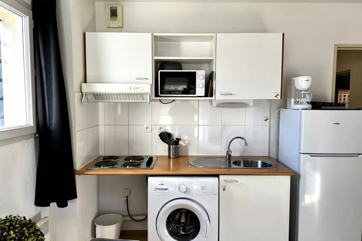 * Une grande pièce de vie ouverte avec sa cuisine toute équipe (frigo combiné, machine à café filtre, bouilloire, plaque, hotte, lave linge et toute la vaisselle nécessaire), un espace repas avec table et chaise, un canapé lit en 140 X 190 un télévision et l’accès wifi gratuit. L’espace de vie donne sur une terrasse extérieur avec mobilier de jardin