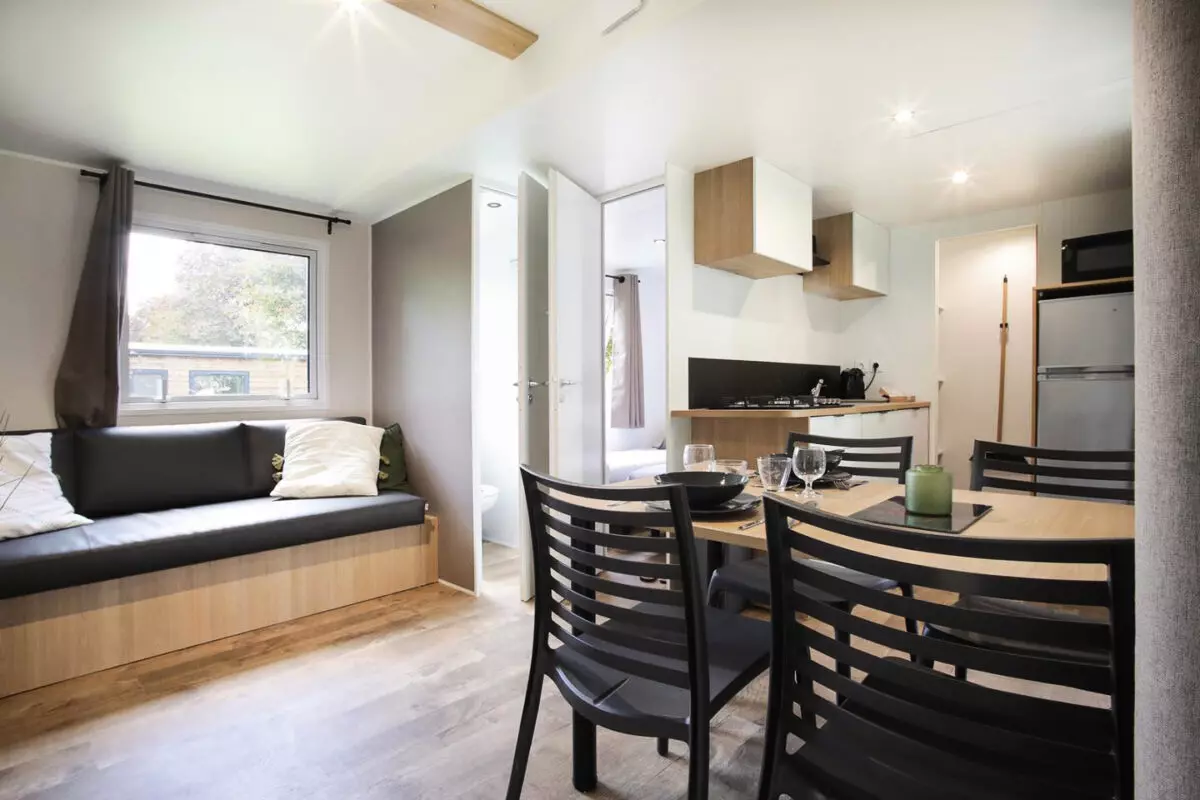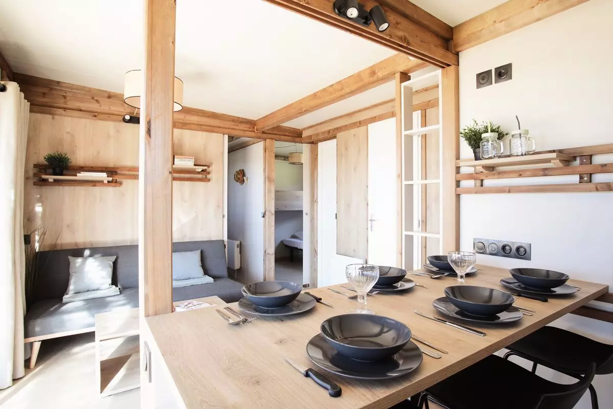 - Coin salon lumineux avec grandes fenêtres donnant sur la prairie, équipé d'un canapé-lit offrant jusqu'à 2 couchages supplémentaires (capacité possible jusqu'à 8 personnes), et espace salle à manger convivial.