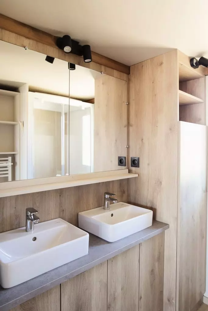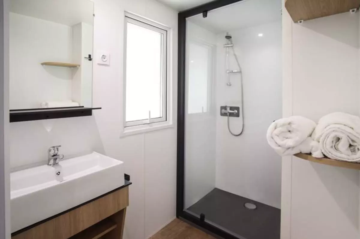 - Salle de bain moderne comprenant une cabine de douche spacieuse (10080 cm), meuble vasque avec rangements et chauffe-eau 80 L garantissant un bon débit d'eau chaude
