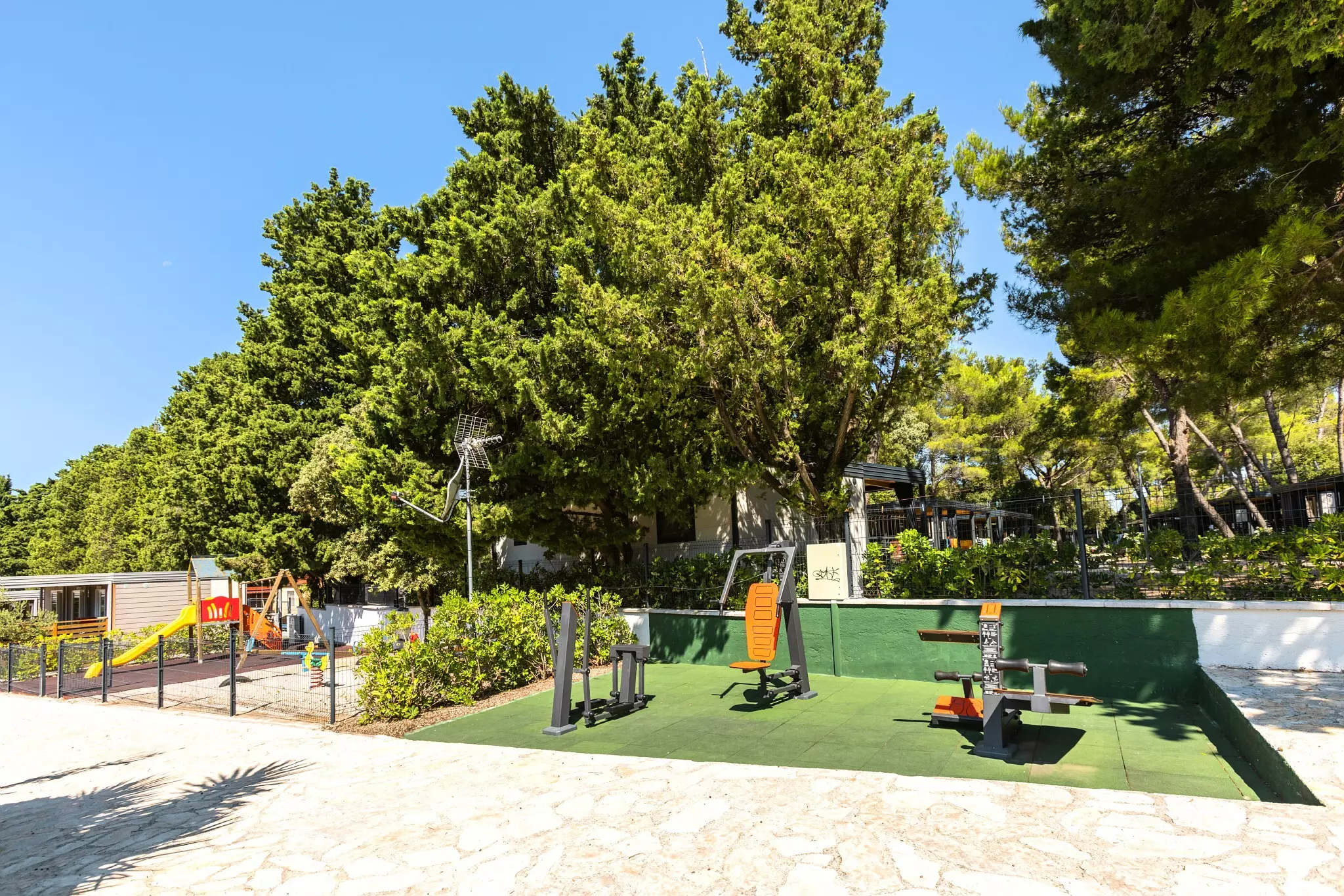 Facilities: free wi-fi (in entire complex), reception (24 hours operated) with lobby and souvenir shop, supermarket (with a bakery), 2 a la carte restaurants (traditional dalmatian restaurant and pizzeria), 4 bars (Sport bar, 2 cocktail bars on the beach, pool bar), cake & ice cream shop, multiple children playgrounds, swimming pool (fresh water, cca. 300 m²), sun loungers and umbrellas by the pool (free of charge) and at the beach (extra charge), parking free of charge (big parking at the entrance to the complex for apartments and mobile homes, and glamping tents have parking next to them), safes (at the reception), ATM machine, wahing machines and dryers, exchange office at the reception, taxi boat line to Trogir (operating in low and high season), shuttle service (extra charge), car rental.