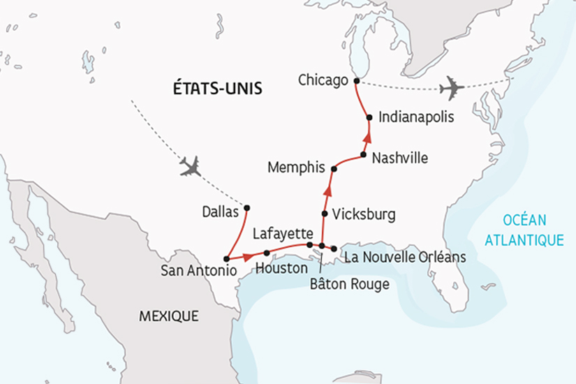 Votre autotour aux États-Unis en Louisiane en 9 jours / 7 nuits. Il s’agit d’un itinéraire de principe : les étapes pourront être modifiées pour des raisons techniques.