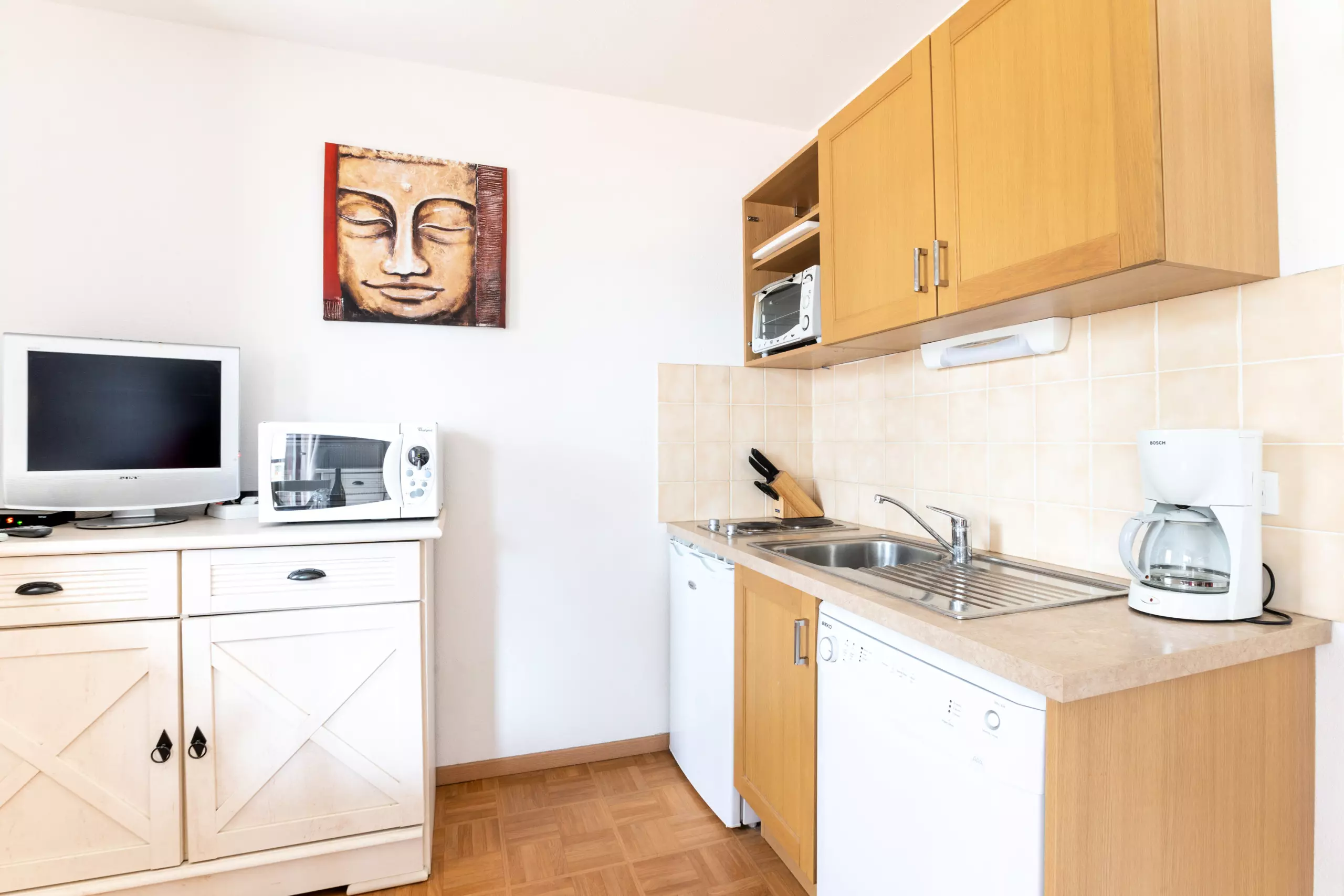 Kit entretien (1 éponge, 1 lavette, 1 flacon de produit multi-usages, 1 flacon de produit liquide vaisselle main, 1 tablette lave-vaisselle et 1 torchon : peut varier selon les résidences).
